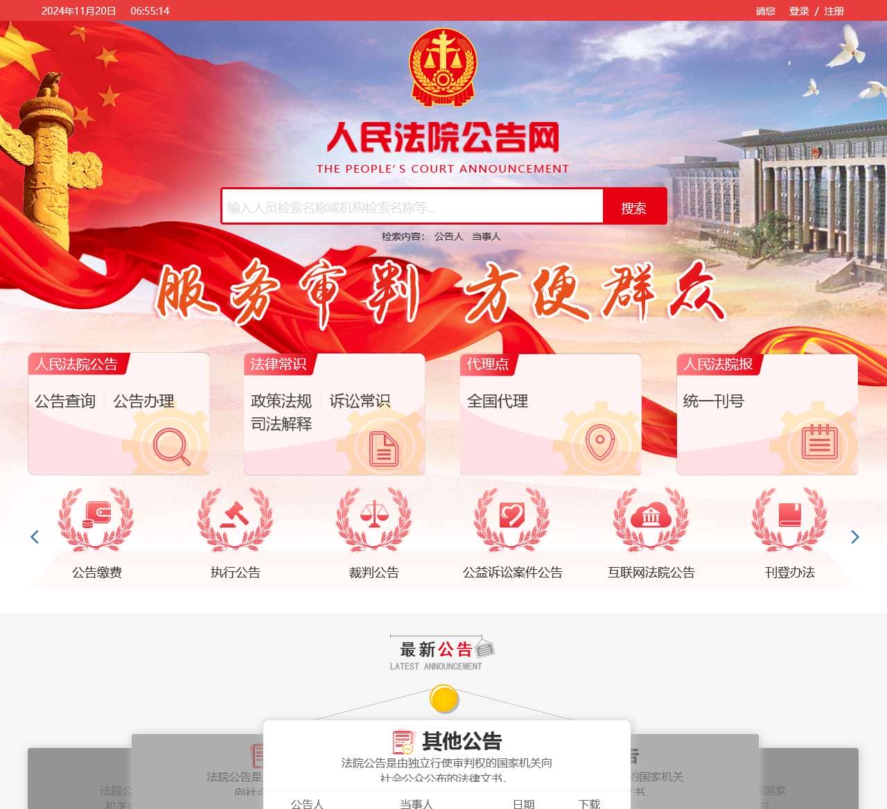 | 公告类型 | 裁判公告、公益诉讼案件公告、互联网法院公告、执行公告 |
