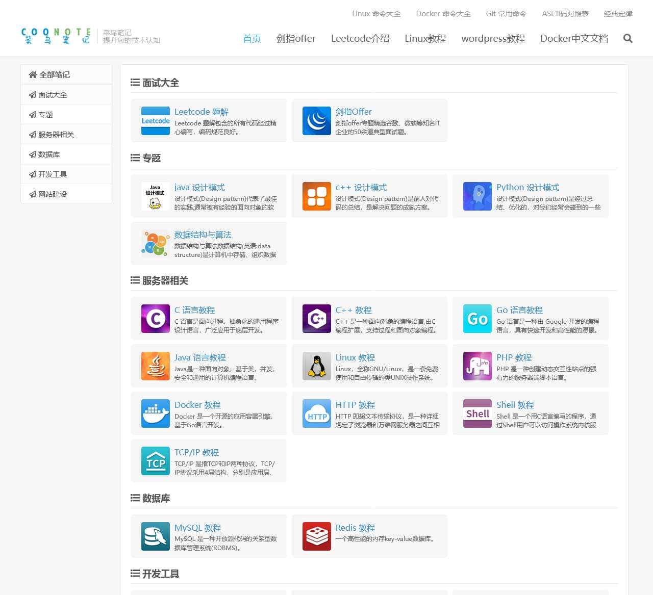 菜鸟笔记(www.coonote.com)分享编程的基础教程笔记及面试题和算法题,介绍c++、redis、python、数据库、mysql面试和算法等各种编程语言的基础知识及编程技巧等IT教程学习数据结构与算法网站。
