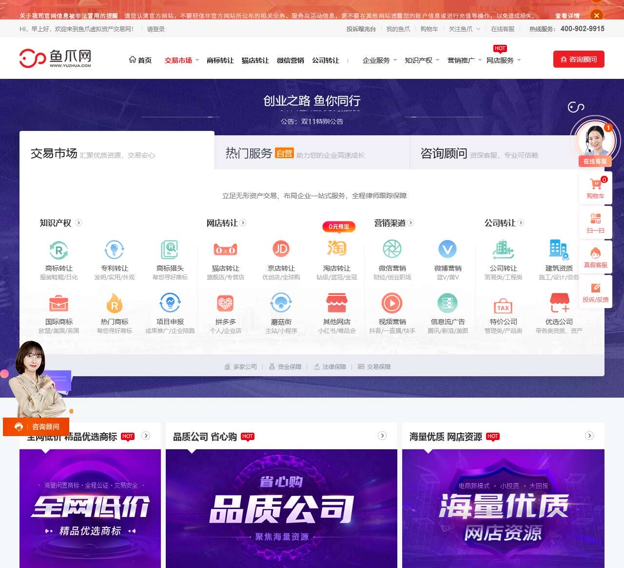 鱼爪网-安心托付、值得信赖的虚拟资产交易服务平台,主要提供商标转让、网络店铺转让等,全程律师跟踪服务,安全又省心。