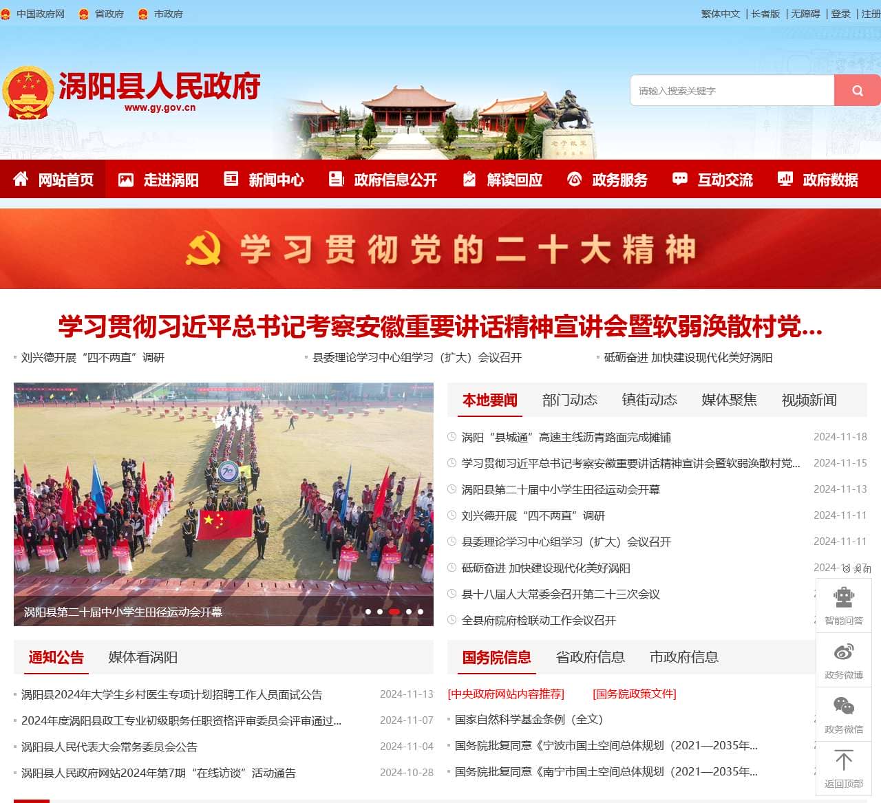 | 通知公告 | 1. 涡阳县2024年大学生乡村医生专项计划招聘工作人员面试公告 2. 2024年度涡阳县政工专业初级职务任职资格评审委员会评审通过名单 3. 涡阳县人民代表大会常务委员会公告 4. 涡阳县人民政府网站2024年第7期“在线访谈”活动通告 |
