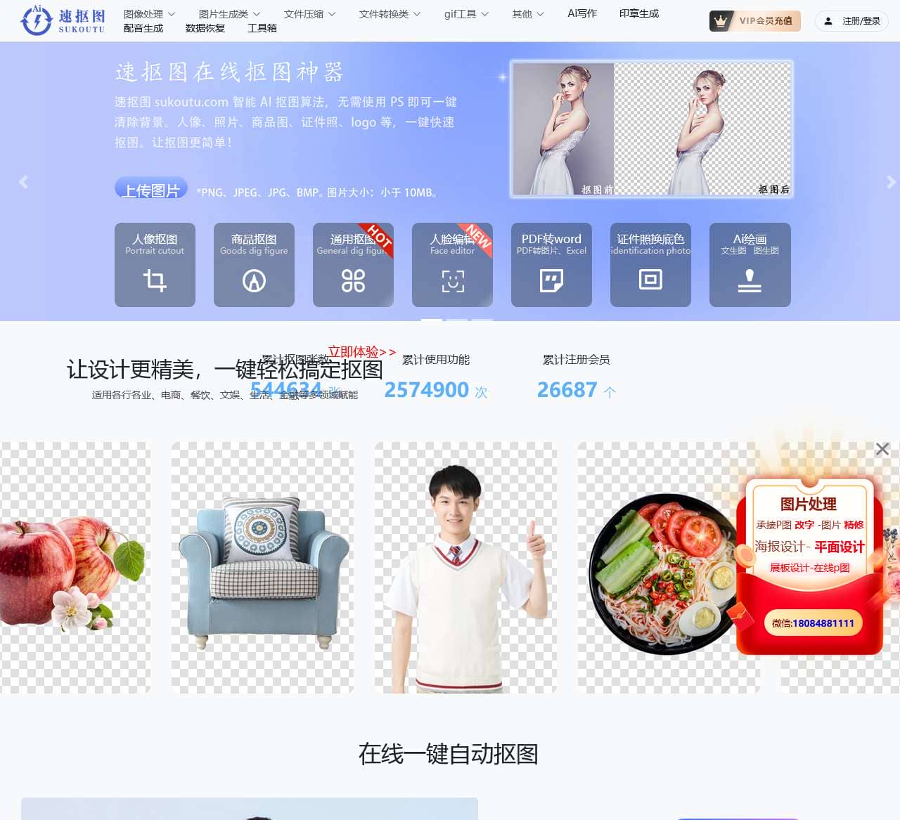 速抠图 sukoutu.com提供免费在线抠图工具和在线ps抠图软件,无需下载 Photoshop软件即可实现在线抠图及图片处理,支持智能抠图、钢笔抠图、矩阵抠图、拖选抠图、橡皮擦图、图案抠图、图片压缩、图片格式转换、高清图片处理等功能。