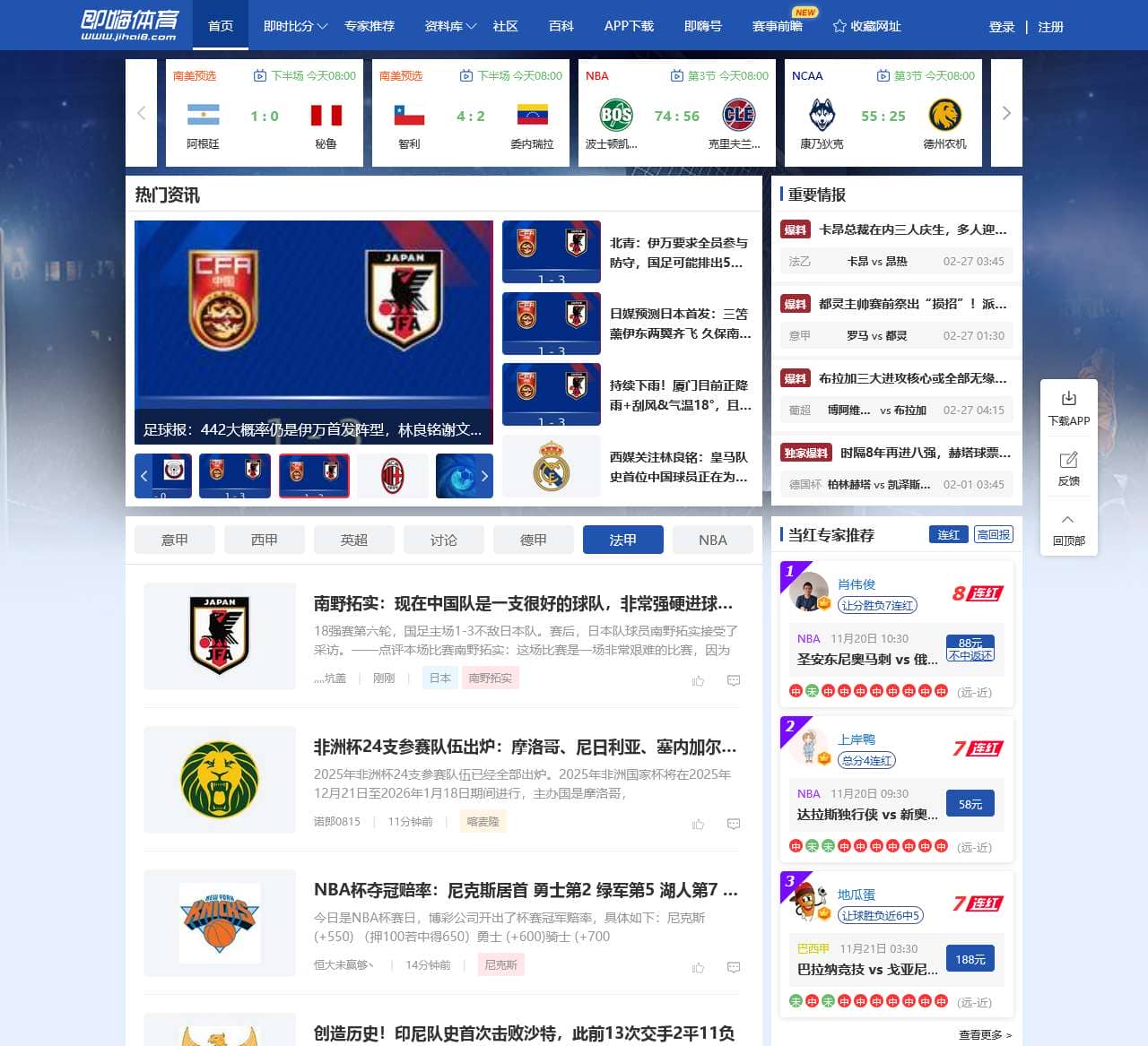 即嗨体育为您带来足球及篮球即时比分、足球及篮球比赛、足球及篮球资料库、足球及篮球分析预测等一系列比赛信息及数据,包括了英超、西甲、意甲、德甲、欧冠、中超、日职联、NBA、CBA及世界杯各种比赛,让球迷及时准确的了解赛事进展和结果。