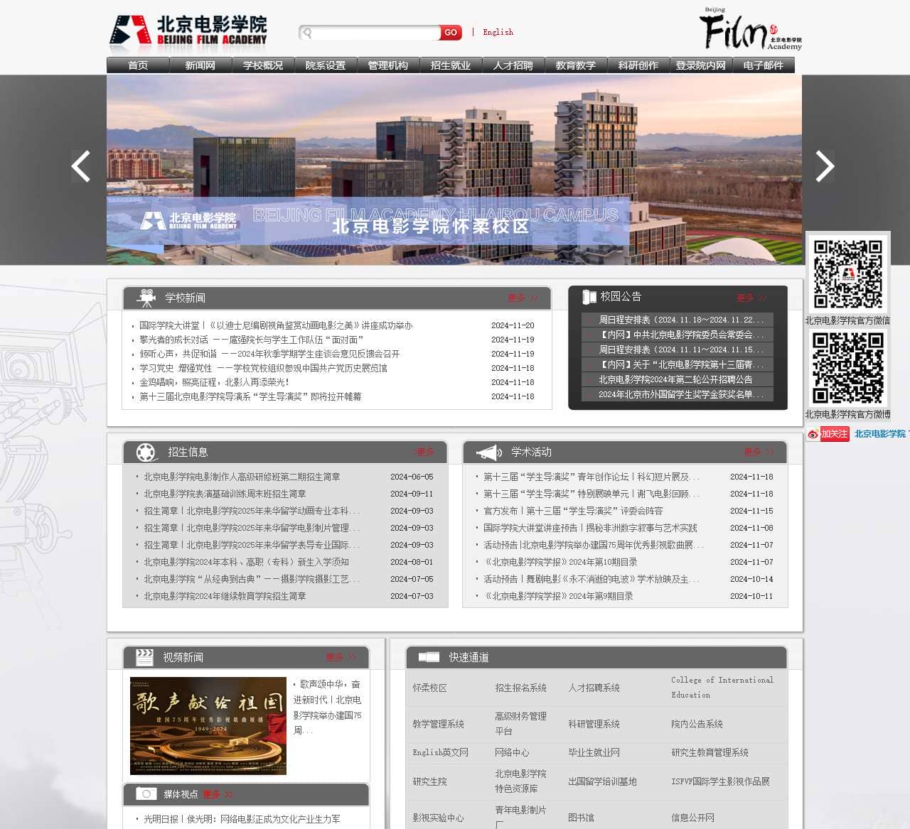 | 怀柔校区系统 | 招生报名系统, 人才招聘系统, College of International Education, 教学管理系统, 高级财务管理平台, 科研管理系统, 院内公告系统, English英文网, 网络中心, 毕业生就业网, 研究生教育管理系统, 研究生院, 北京电影学院特色资源库, 出国留学培训基地, ISFVF国际学生影视作品展, 影视实验中心, 青年电影制片厂, 图书馆, 信息公开网, 党建思政网, 师德建设网 |