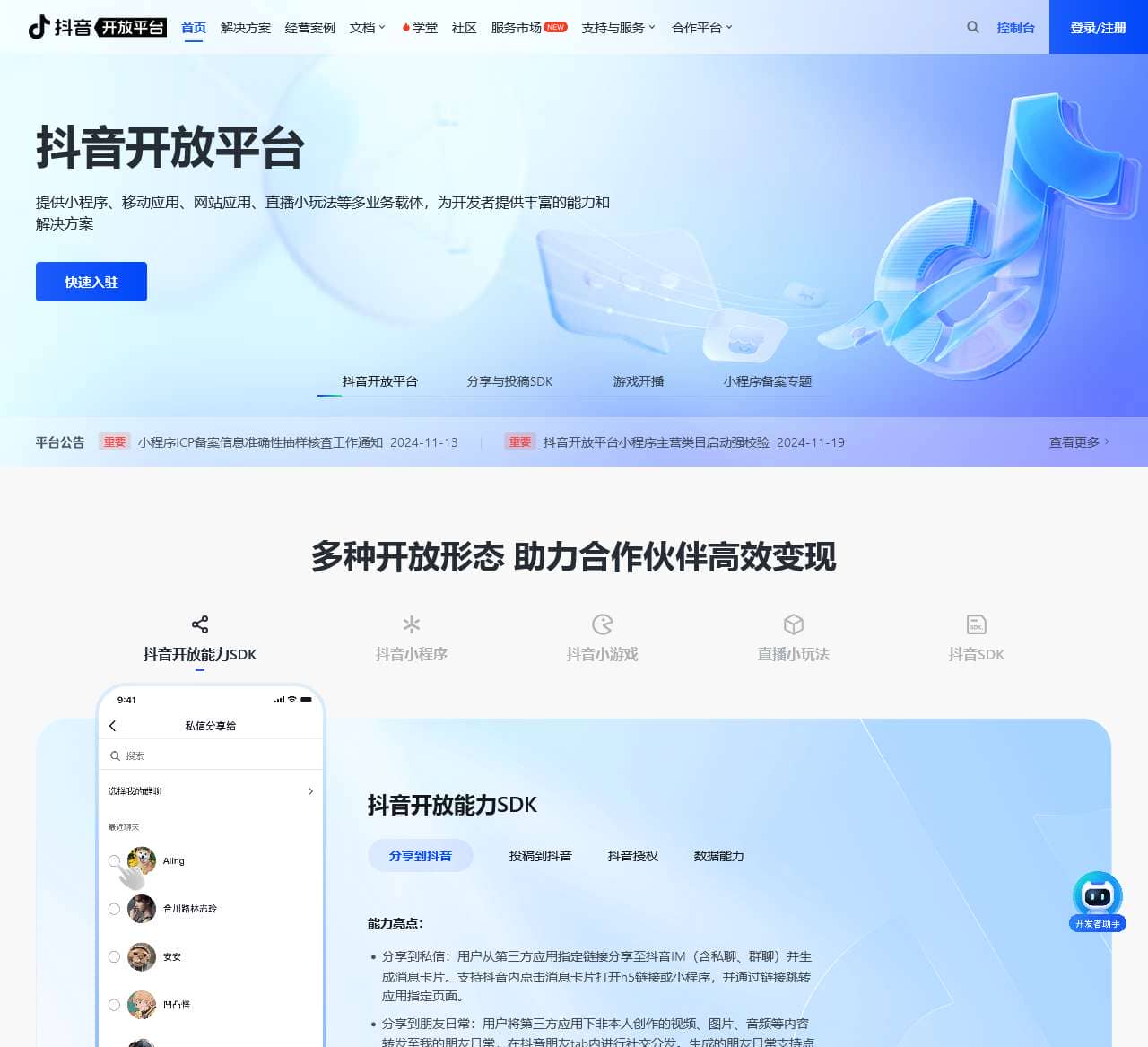 基于抖音丰富的场景,面向开发者提供创建、经营抖音小程序的全流程能力,满足在抖音上获客-留存-转化-复访-促活过程中的个性化业务需求。同时提供能力开放的应用生态,支持开发者自有的移动或网站应用接入抖音开放能力。