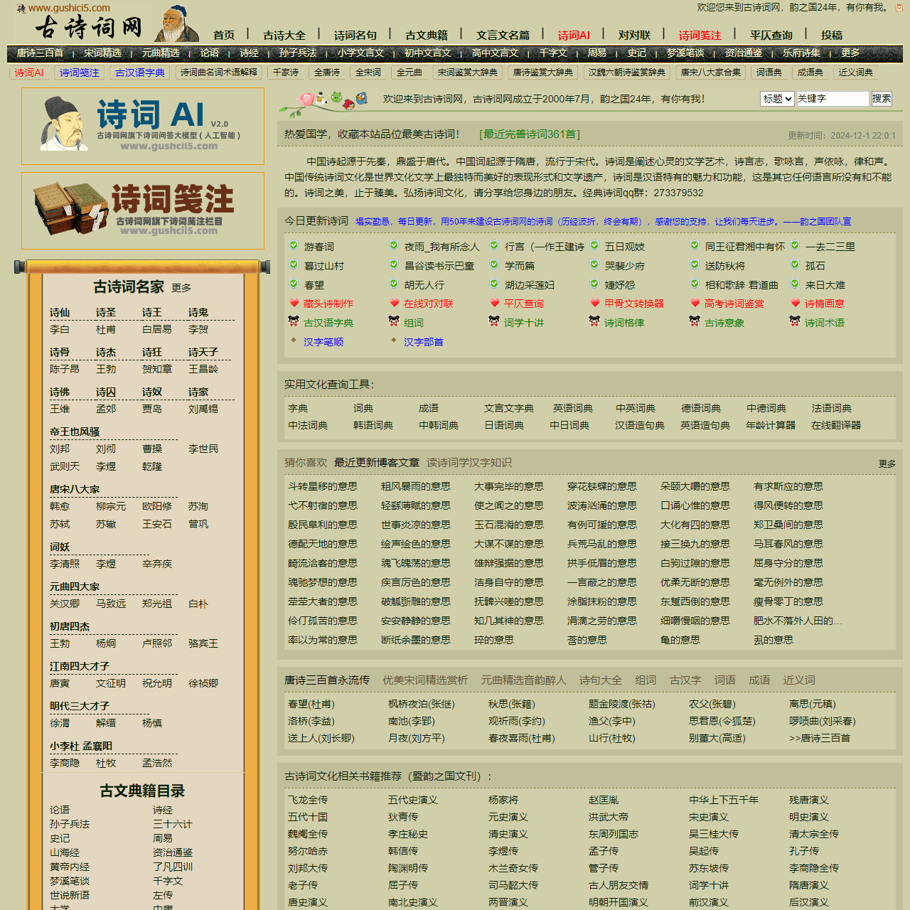古诗词网(www.gushici5.com)提供:唐诗三百首、宋词精选、元曲精选等古诗大全、诗词名句;论语、史记、战国策等古文典籍译文;初中文言文、高中文言文、古文观止等文言文名篇翻译,并提供诗词名句,古诗词鉴赏等相关国学知识,古诗词网成立于2000年7月韵之国有你有我。
