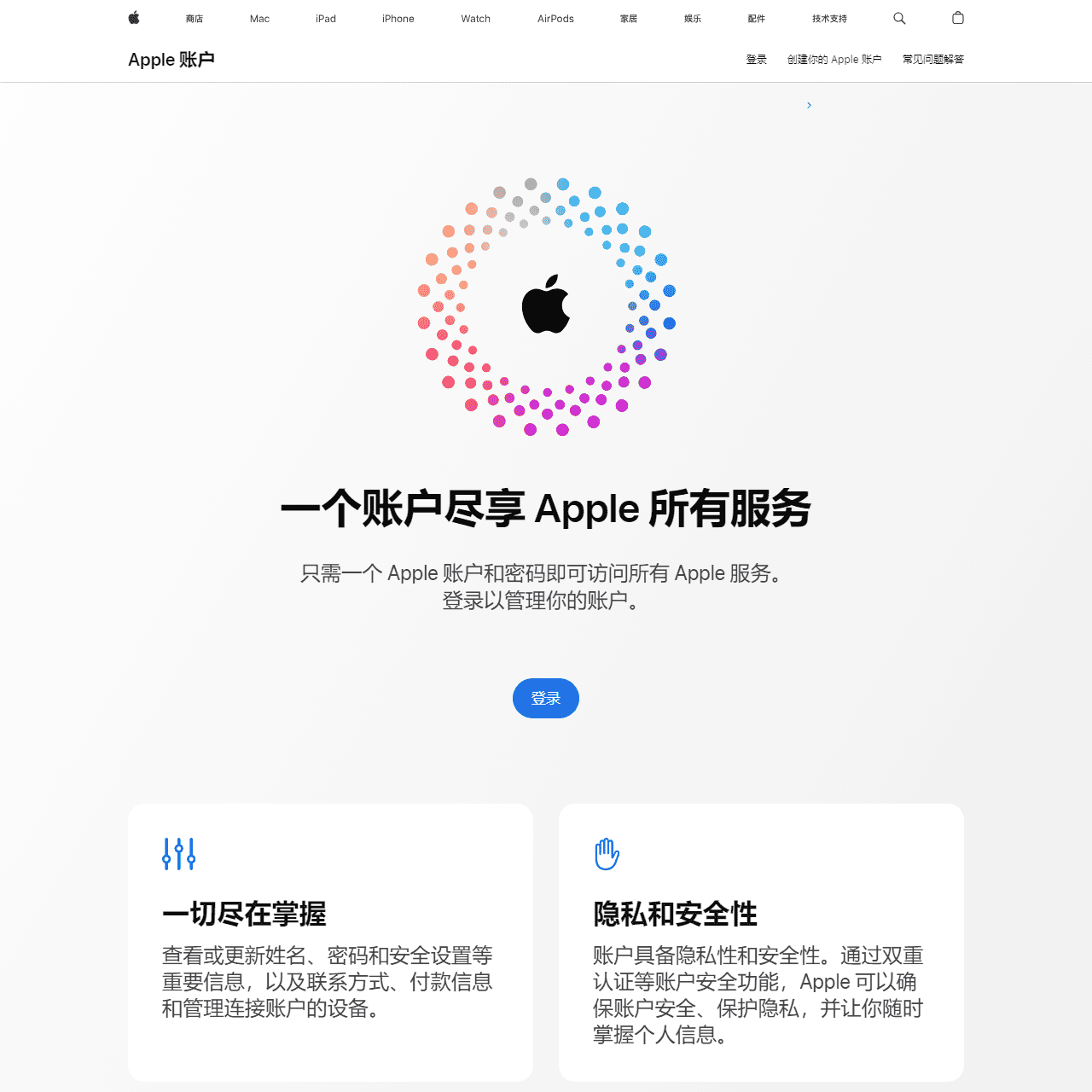 | Apple 账户 | 登录登录, 创建你的 Apple 账户, 常见问题解答, 了解更多 |