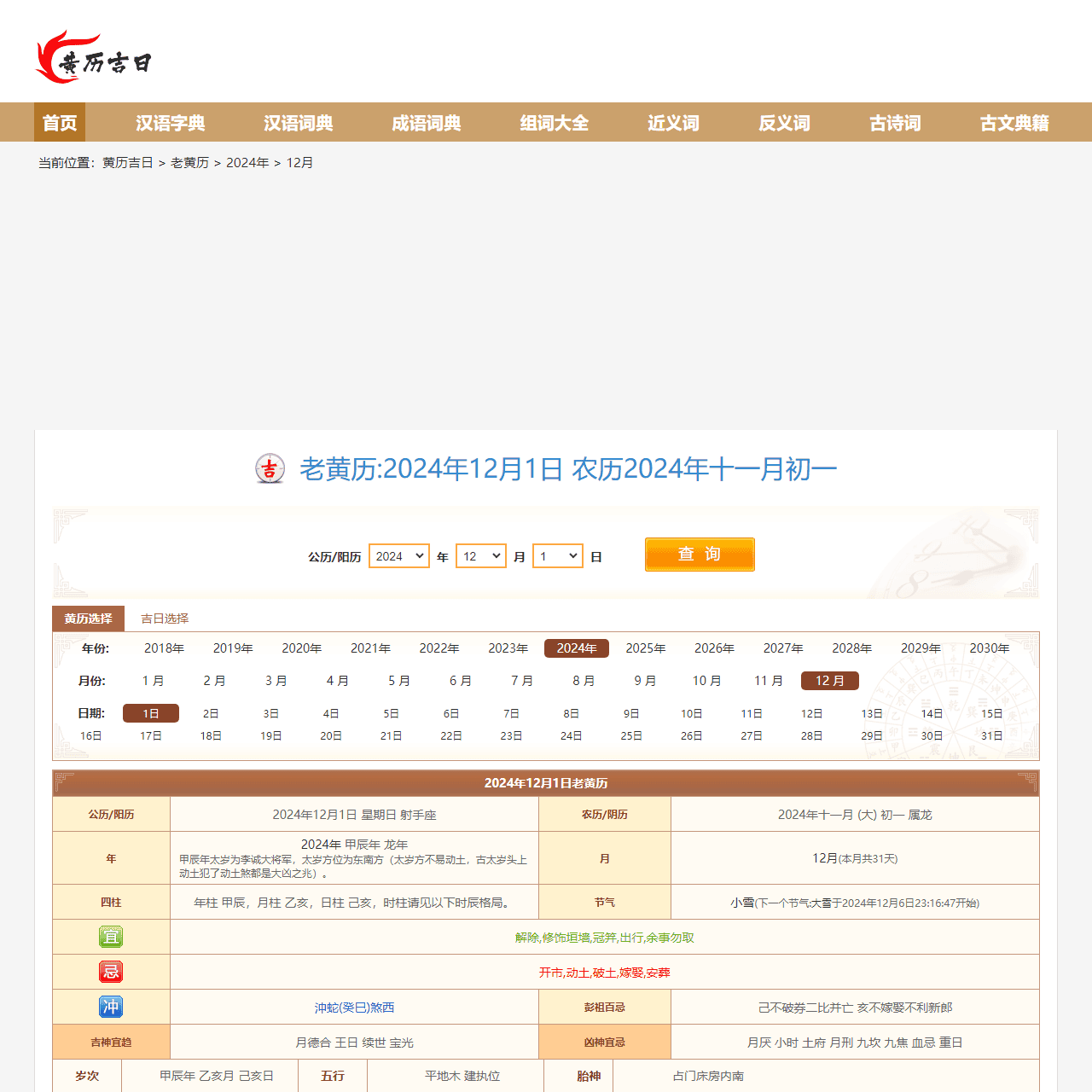 黄历吉日在线查询为您提供2024黄历吉日,万年历老黄历,老黄历吉日查询,万年历,老黄历,黄道吉日,黄道吉日查询,黄历吉日查询,老黄历查询,老黄历吉日,黄历吉日,吉日查询等,助你快速择选嫁娶吉日,订婚吉日,搬新家吉日,开工吉日,乔迁吉日,入宅吉日等,让您事事顺心,大吉大利.