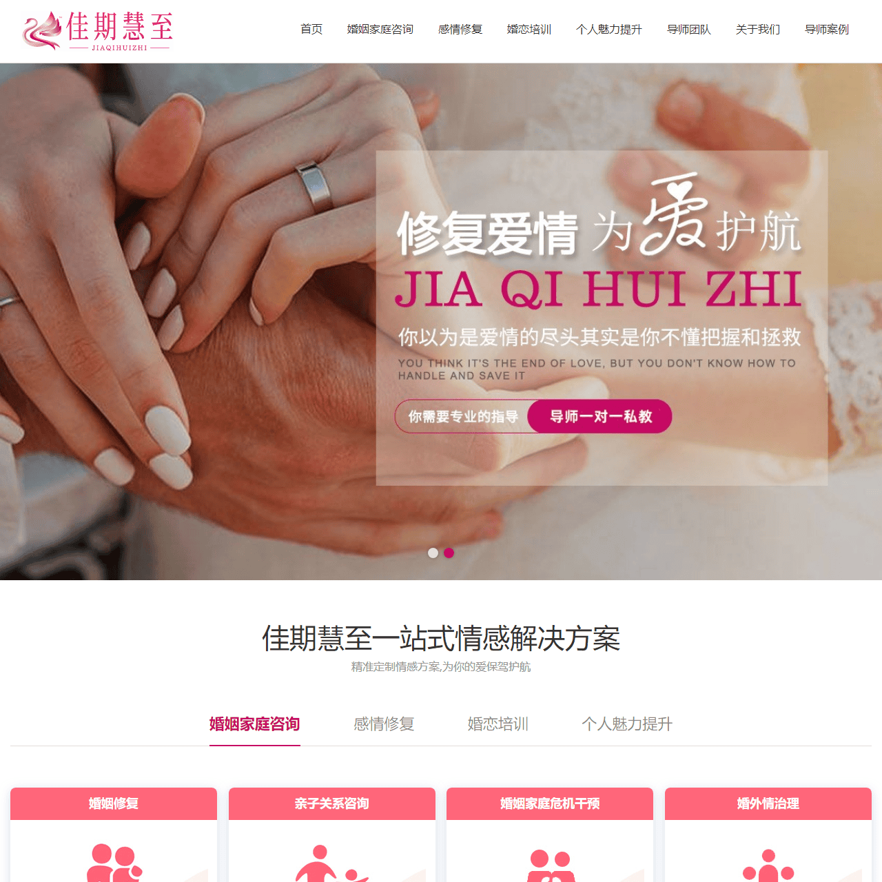 佳期慧至™ 致力于中国两性情感修复服务标杆品牌,由多位著名两性心理学专家和明星导师组成,专注于两性情感修复,对情商、爱商、性商,逆商、财商等多维度提升拉练。 专注情感内容和身心灵知识高价值干货输出,为所有情感问题者提供教练式咨询服务。多年来采用线上课程教学数万课时 ,导师一对一私教案例数千,多地线下沙龙活动等,得到广大粉丝的充分认可和成长跟随。