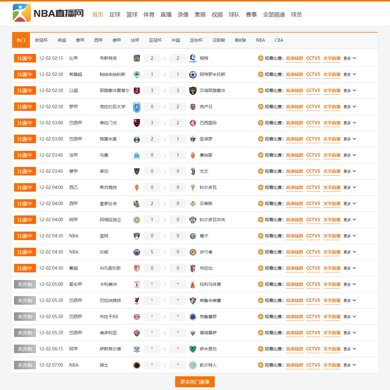 | 比赛中 12-02 04:30 | NBA | 篮网 vs 魔术 | 0 : 0 | 高清线路, CCTV5, 文字直播, 比分直播, 动画直播, 腾讯体育, 咪咕体育, 爱奇艺体育, PP体育, 新浪体育 |