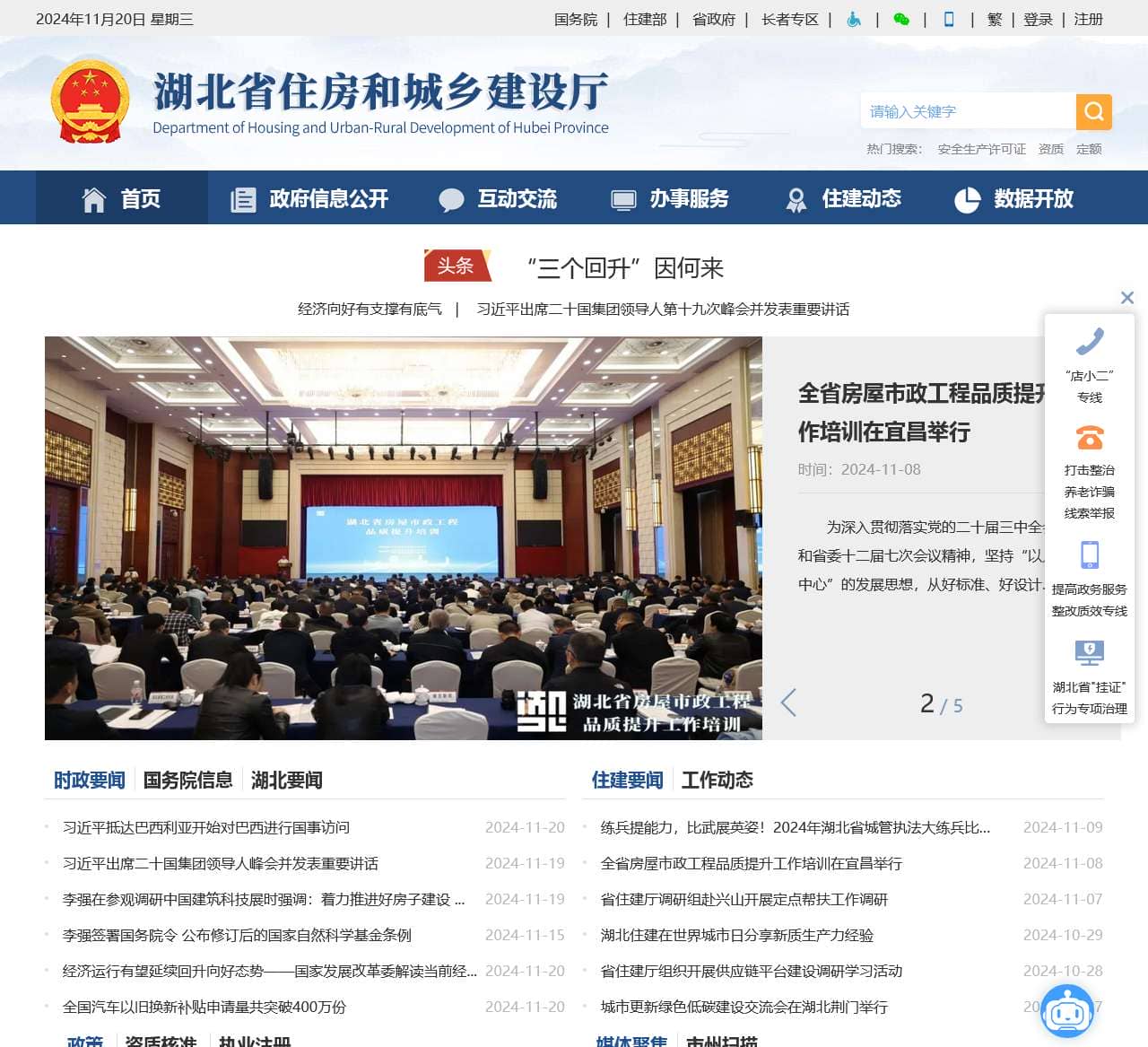 | 湖北要闻 | 2024-11-20 经济运行有望延续回升向好态势——国家发展改革委解读当前经济形势,2024-11-12 王蒙徽主持召开省委专题会议 |