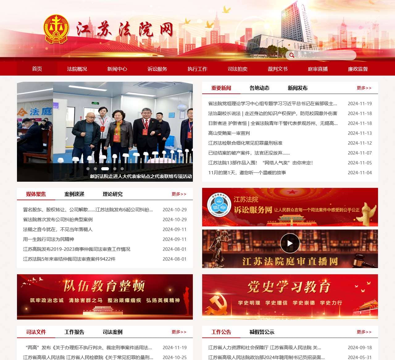 | 重大新闻 | 2024-11-19:省法院党组学习习近平总书记重大讲话; 2024-11-18:法治副校长说法; 2024-11-18:全省法院青年干警参观高科技企业; 2024-11-13:高山受贿案一审宣判; 2024-11-12:江苏法检联合细化常见犯罪量刑标准; 2024-11-07:破产案件法官不放弃; 2024-11-05:江苏法院13部作品入围; 2024-11-04:11月第1天的温暖故事 |
