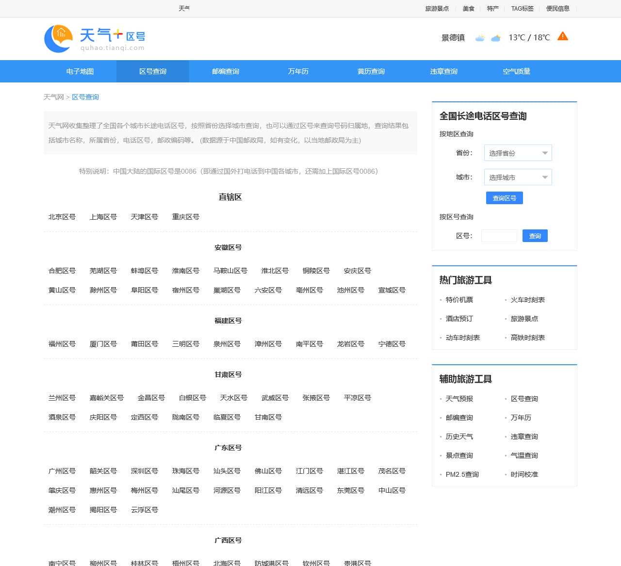 天气网区号查询(quhao.tianqi.com)整理收集了全国各个城市长途电话区号,按照省份选择城市查询,也可以通过区号来查询号码归属地,查询结果包括城市名称,所属省份,电话区号,邮政编码等。