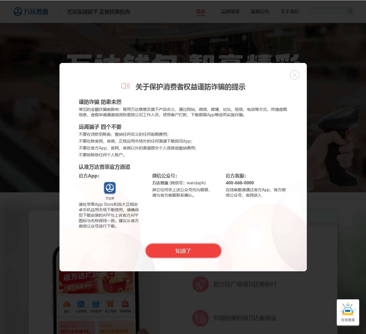万达普惠是万达集团旗下普惠金融品牌,立足万达生态场景,依托全球最大线下商业资源与开放平台,以“科技+金融+实体+互联网”为核心驱动力,结合海量多维交易数据优势与现实场景,创新融合大数据、云计算、移动互联和智能风控等科技金融和互联网手段,缩短用户与金融服务的距离,为普罗大众和小微企业提供高效、优质、普惠的综合金融服务,践行科技引领金融的普惠发展之路。