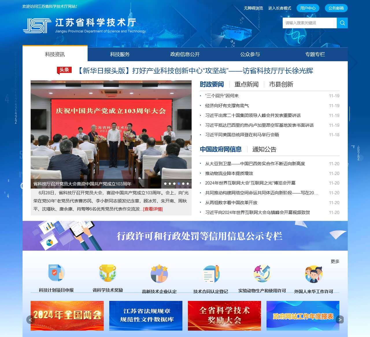 | 公众参与 | 我为2025年江苏省《政府工作报告》提提议, 2024江苏产学研合作对接大会开幕 信长星出席并启动开幕 许昆林致辞, 进一步深化科技体制改革 着力打造具有全球影响力的产业科技创新中心 科技专场新闻发布会, 省科技厅召开党员大会喜迎中国共产党成立103周年, 我省牵头成立长三角种业创新实验室联盟, 荷兰北布拉邦省经济发展署署长博荷特·冯德莱一行访问省科技厅 |
