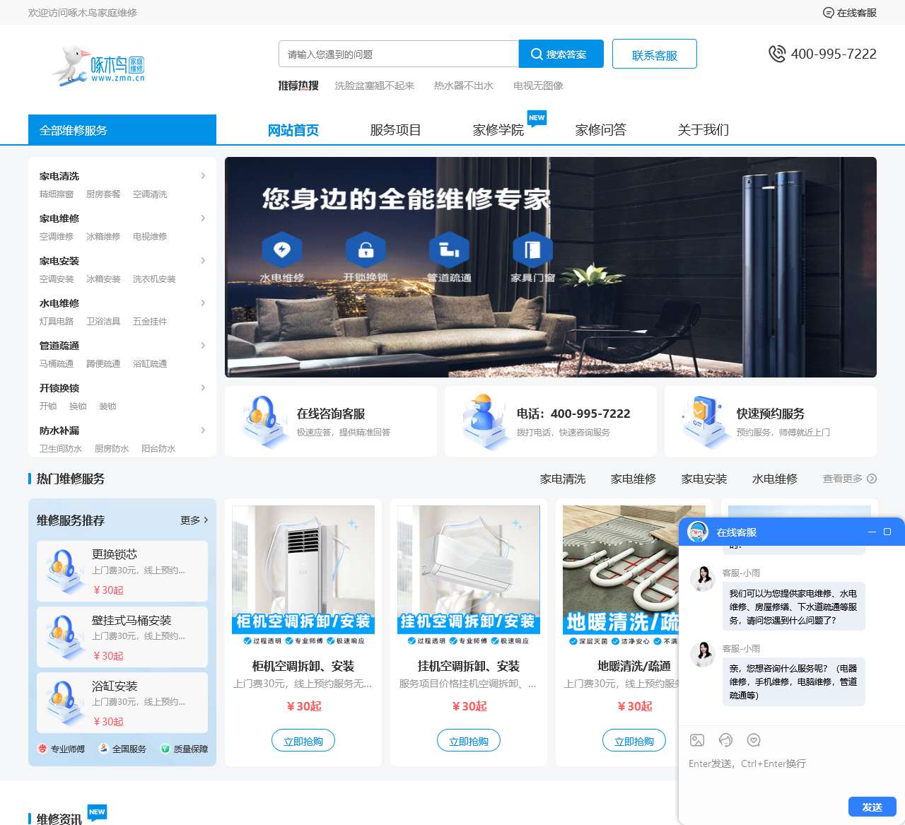 | 家电维修 | 空调维修,冰箱维修,电视维修,油烟机维修,洗衣机维修,热水器维修,燃气灶维修,微波炉维修,饮水机维修,电饭煲维修,蒸包机维修,消毒柜维修,咖啡机维修,空气净化器维修,地暖维修,甩干机维修,吸尘器维修,取暖器维修,净水器维修,空调扇维修,回水器维修,按摩椅维修,跑步机维修,冰柜维修,冷藏展示柜,自动售卖机维修 | |