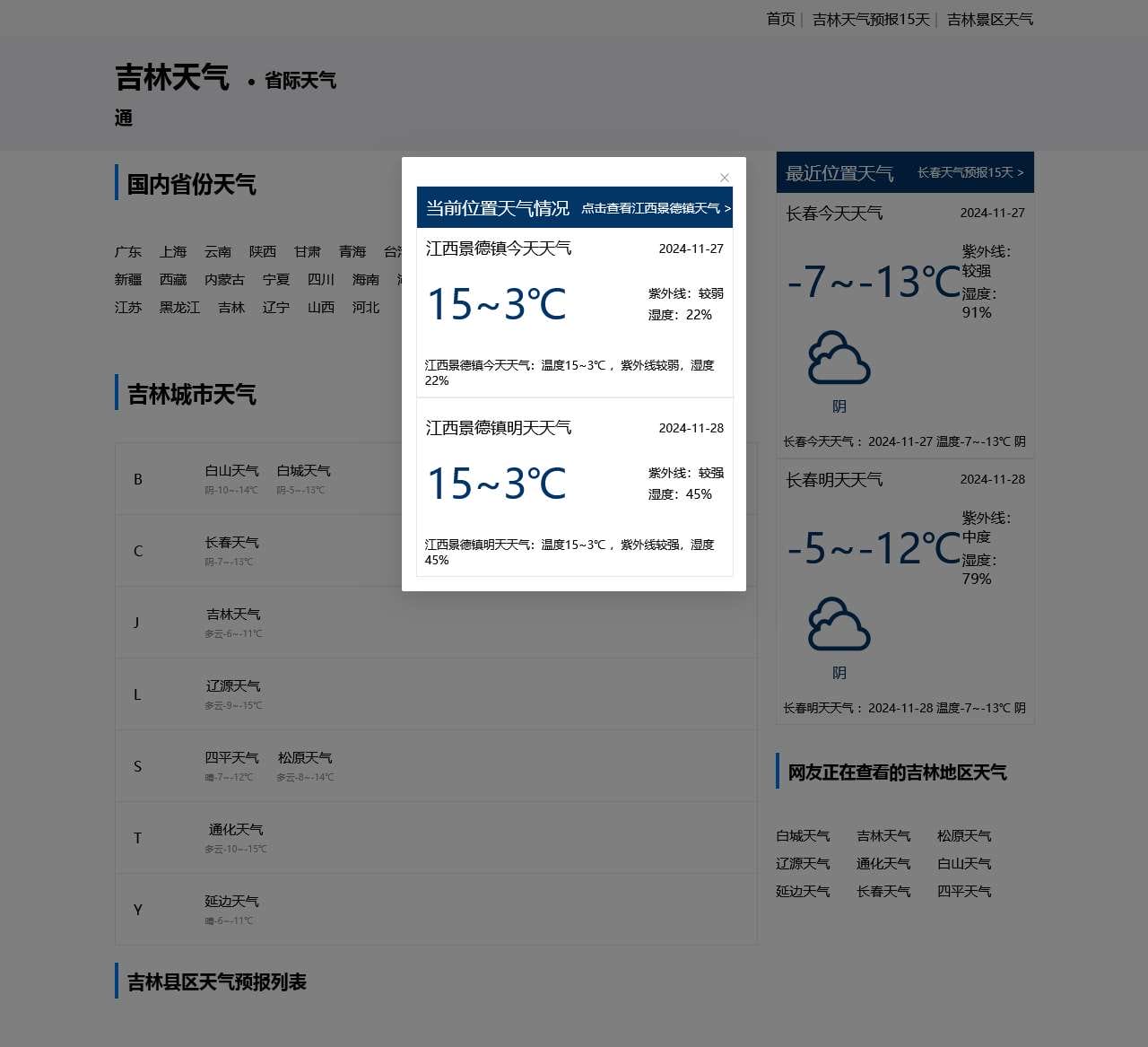 省际天气通吉林站提供吉林天气预报、吉林全省范围内实时天气、吉林未来15天气和景点天气预报服务,让您随时掌握吉林各地的天气变化,为您的出行和生活提供便利。