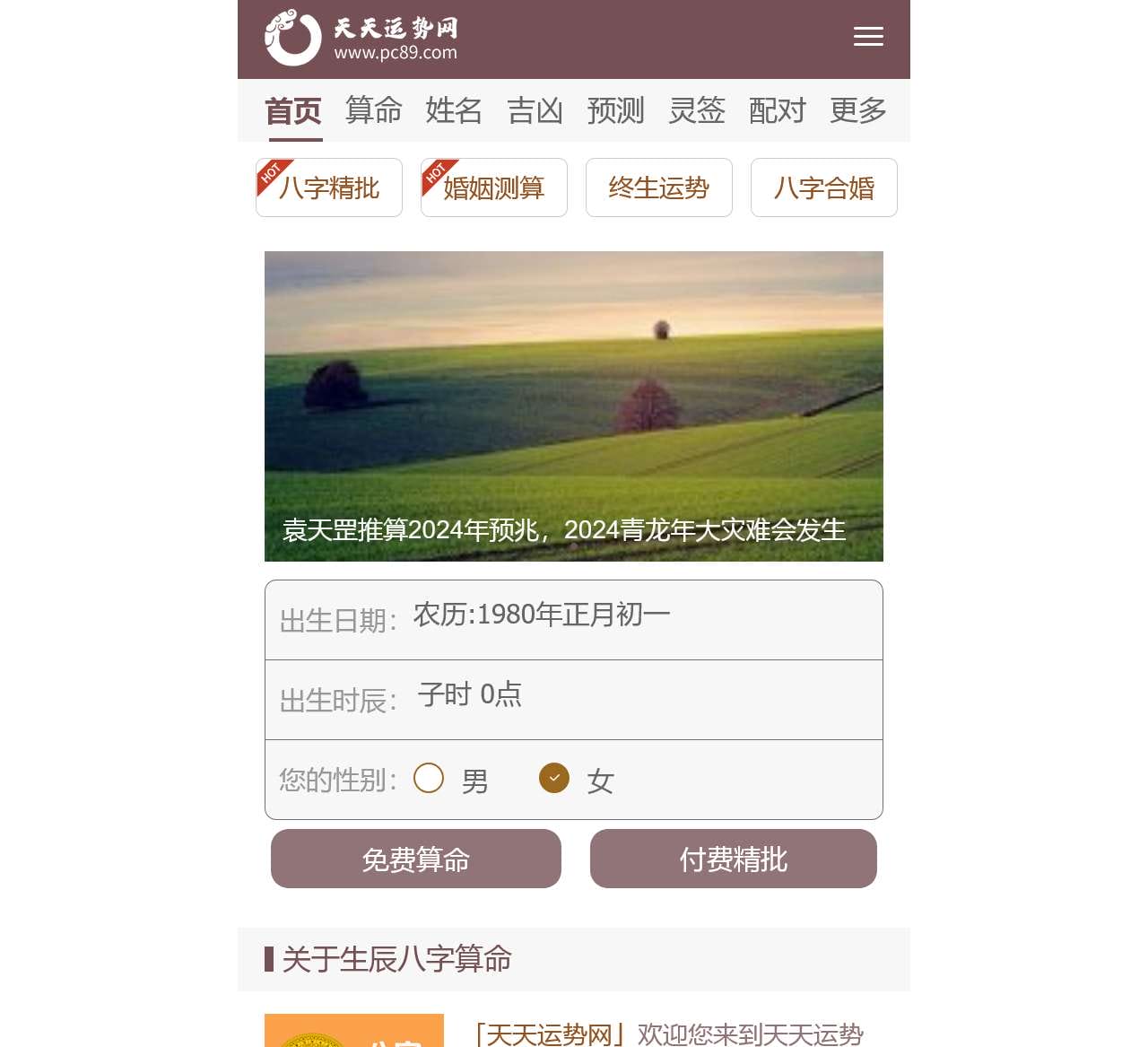 欢迎光临天天运势网!本站是网上算命的网站,提供免费算命、生辰八字算命、姓名测试、星座运势、周易八卦等最准的在线算命项目,提供大师亲算服务。