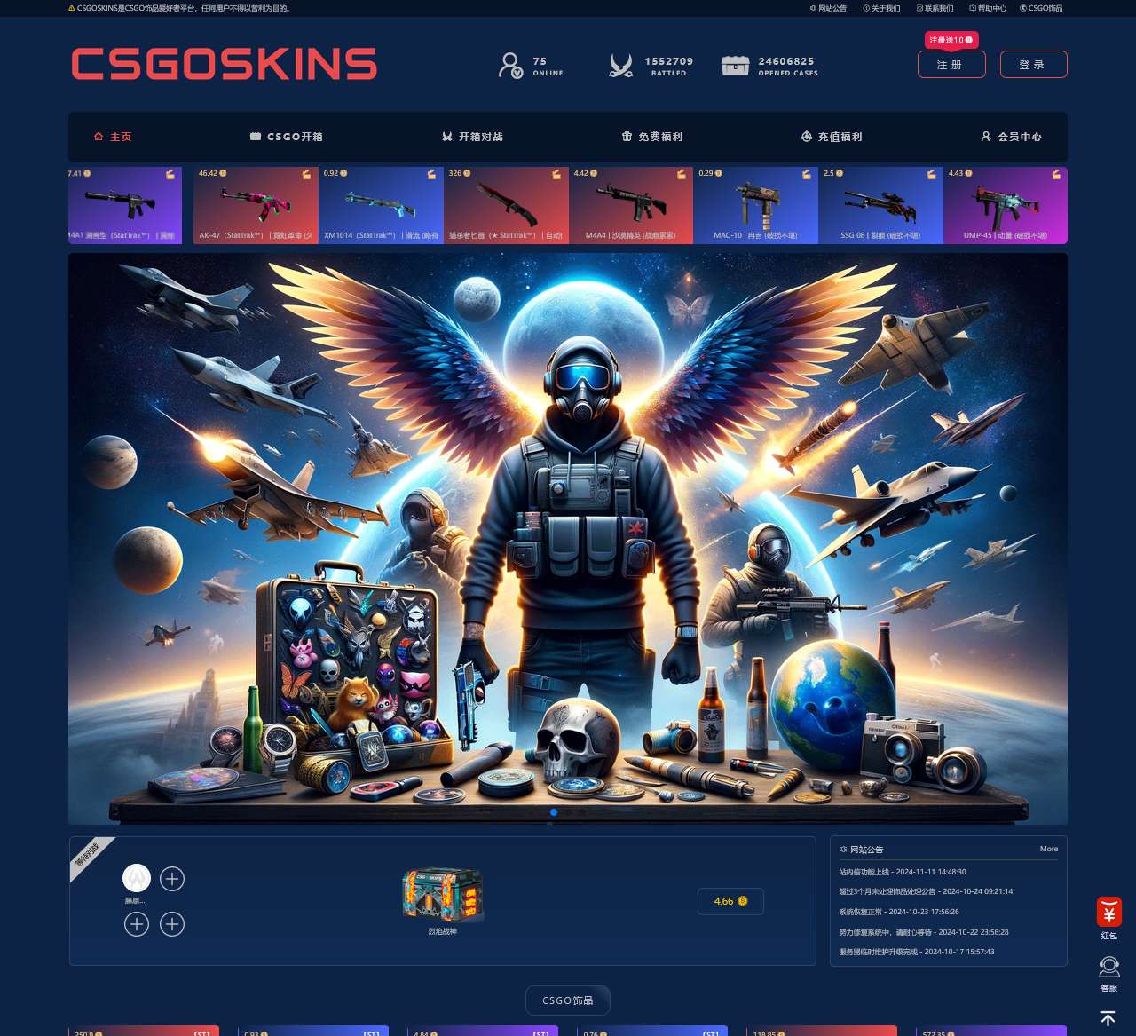 CSGOSKINS开箱网致力于CSGO开箱网站的开发和运营,主要提供CSGO盲盒开箱和CSGO饰品开箱对战服务,会员首次注册送免费开箱,还有免费红包、充值红包等会员福利。CSGOSKINS开箱网爆率高、秒取回、7X24小时即开即取,是良心的CSGO开箱网站,平台已同步更新到CSGO2开箱网站。