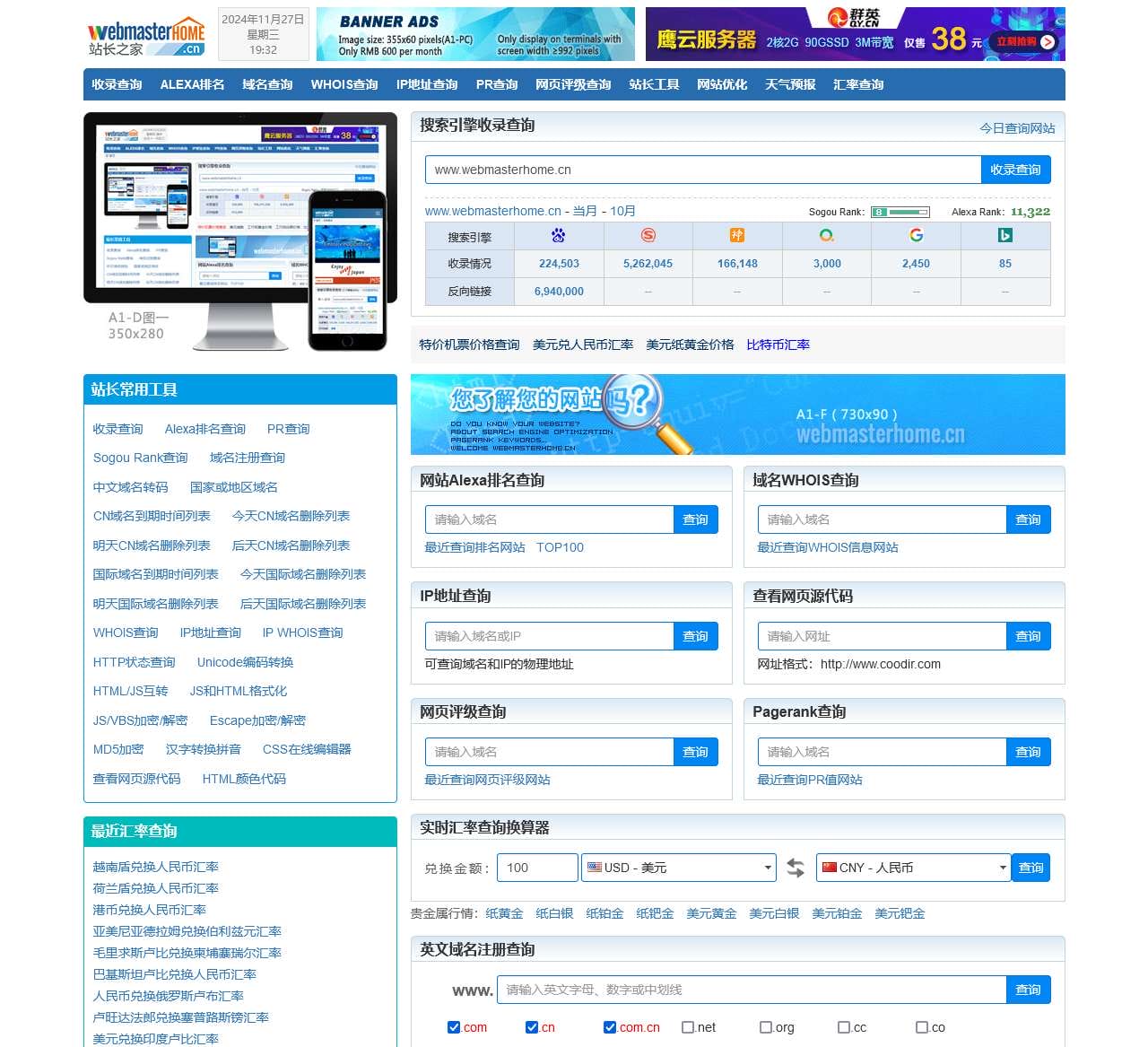 站长之家提供网站综合信息查询,包括搜索引擎收录查询,反向链接查询,Alexa排名查询,PR查询,IP地址查询,WHOIS查询,域名注册查询,过期域名查询等站长工具。