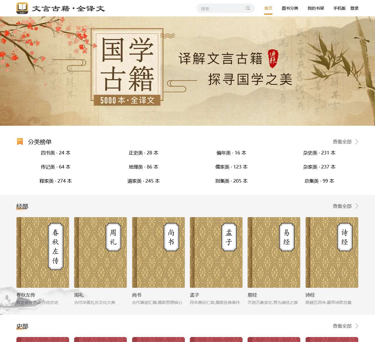 文言古籍网提供接近5000多本的国学典籍等各类经典国学古文古籍,所有书籍都包含原文翻译、白话文、译文、对照文。书籍包括经史子集二十四史《史记》、《汉书》、《三国志》、《宋书》、《魏书》、《清史稿》、《左传》、《孟子》、《道德经》、《易经》、《晋书》、《明史》、《全唐诗》、《全宋词》、《古文观止》、《资治通鉴》等等