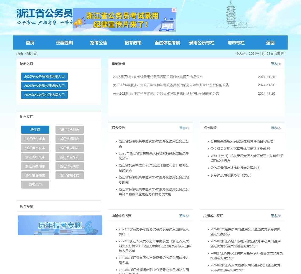 | 招考公告 | 2025年度浙江省考试录用公务员公告 2025年浙江省公安机关人民警察特殊职位招录考试公告 浙江省机关单位2025年度公开遴选和公开选调公务员公告 |