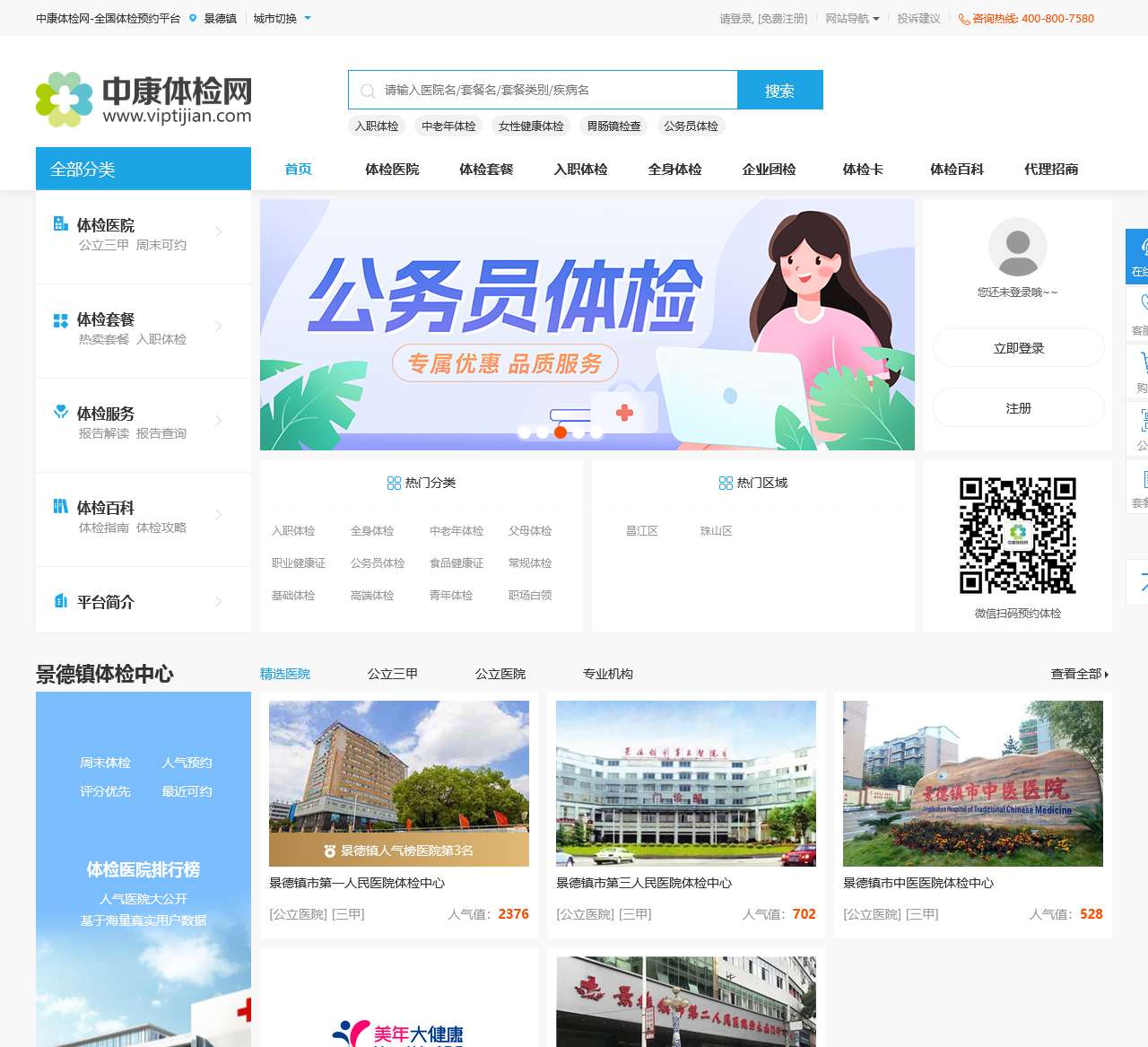 中康体检网是景德镇优质的体检预约一站式服务平台,免费提供景德镇9家公立医院与民营医院的体检预约服务;预约可享受体检打折优惠,还有专业体检指导,部分医院享受免排队等VIP待遇。专业健康服务,品质保障,为您的健康保驾护航。