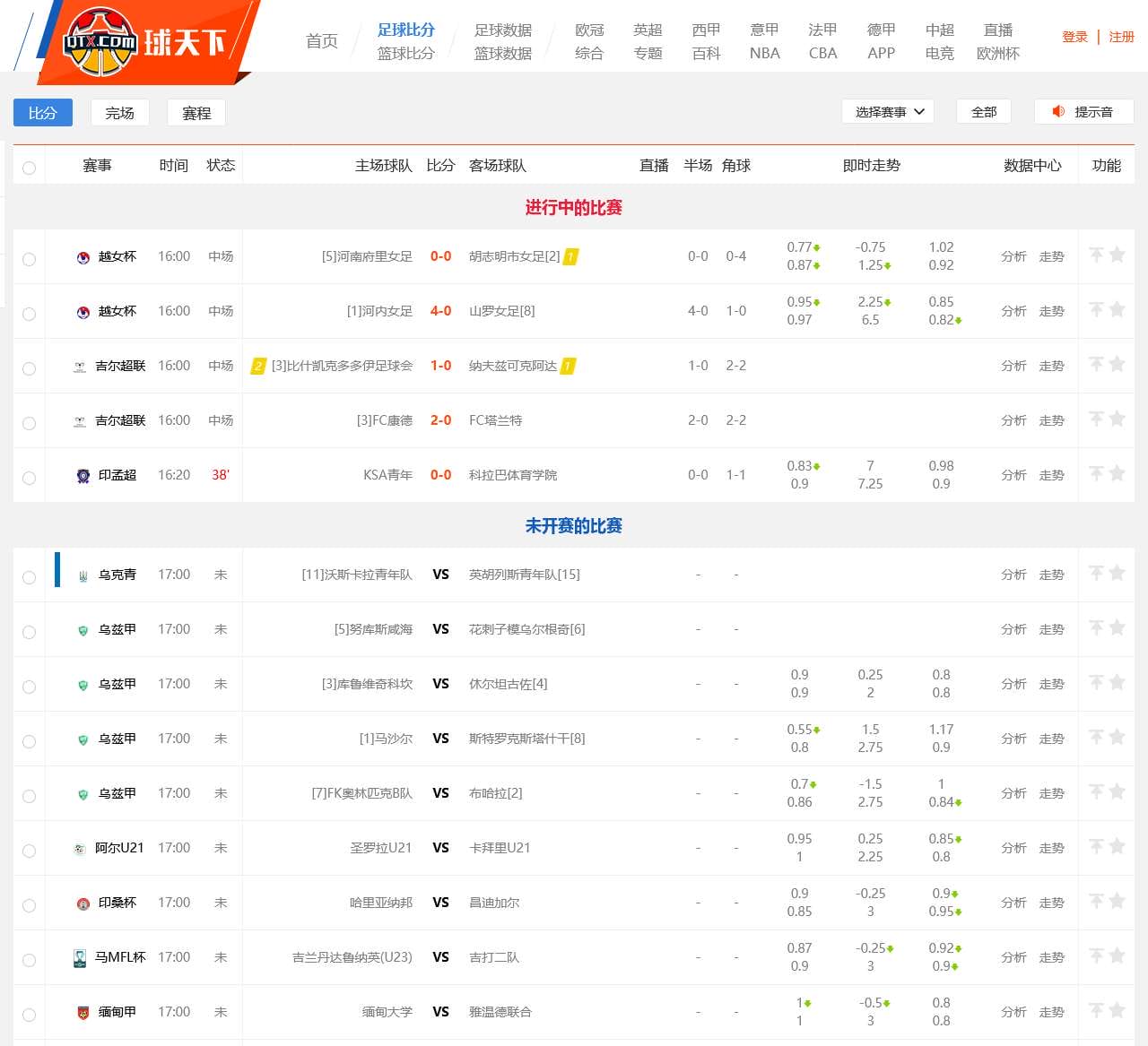 球天下体育足球比分为您提供最快最全最准的即时足球比分直播以及足球比赛动画直播,同时提供最全的足球赛事数据分析,足球指数,比赛现场数据等相关信息。