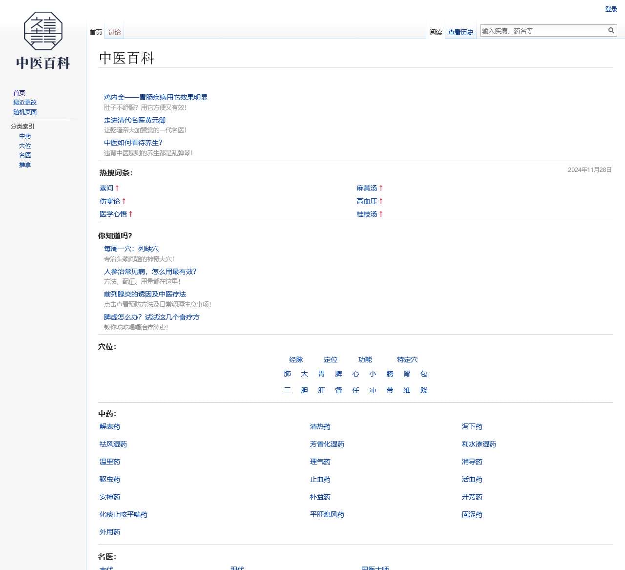 已建有33万篇中医药词条,涵盖中医名词、针灸腧穴、方剂中药、中医名家、疾病、症状等内容,供中医爱好者和专业人士查阅。