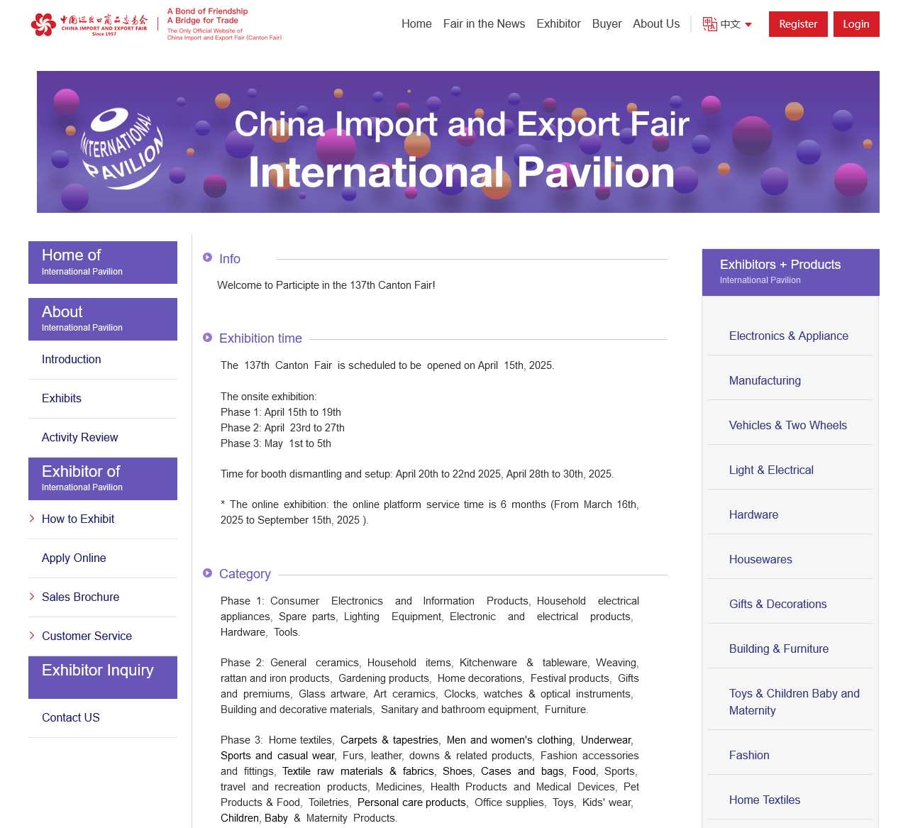 | Exhibit Categories | Electronics & Appliance, Housewares, Gifts & Decorations, Building & Furniture, Toys & Children, Baby & Maternity, Home Textiles, Health & Recreation, Food |