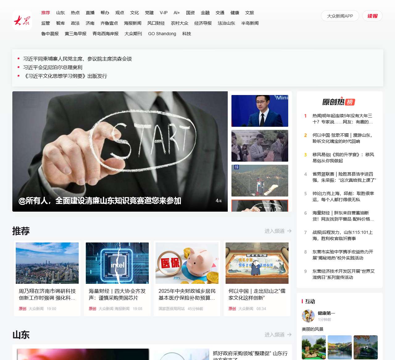 | 习近平同柬埔寨人民党主席、参议院主席洪森会谈 | 习近平会见尼泊尔总理奥利 | 《习近平文化思想学习纲要》出版发行 | 进入频道 | 周乃翔在济南市调研科技创新工作时强调,强化科技创新和产业创新深度融合,为推动高质量发展注入强劲动力 | 原创大众新闻19:00 | 海量财经 | 四大协会齐发声:谨慎采购美国芯片 | 原创大众新闻·海报新闻19:08 | 2025年中央财政城乡居民基本医疗保险补助预算提前下达 | 国家医保局网站45分钟前 | 何以中国|走出尼山之“儒家文化这样创新” | 原创大众新闻08:34 | 进入频道 | 这个周末,山东省第五届财会知识大赛决赛来了!原创大众新闻20:01 | 抓好政府采购领域“整建促” 山东行动方案来了 | 原创大众新闻19:50 | 保障老有所养!山东启动全省养老保险基金审计 |