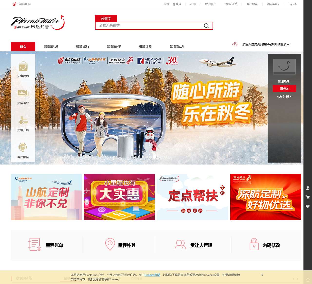 | 关于国航 | 关于国航 / 国航官网 / 凤凰知音 / 联系我们 / 法律声明 / 隐私条款 / Cookies声明 |