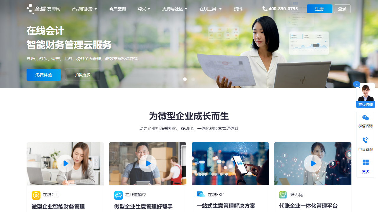 金蝶财务软件免费下载及金蝶进销存软件免费下载,包括在线会计、在线进销存、代理记账、发票查询等。适合小微企业会计记账,免下载免安装,热线咨询电话:400-830-0755。