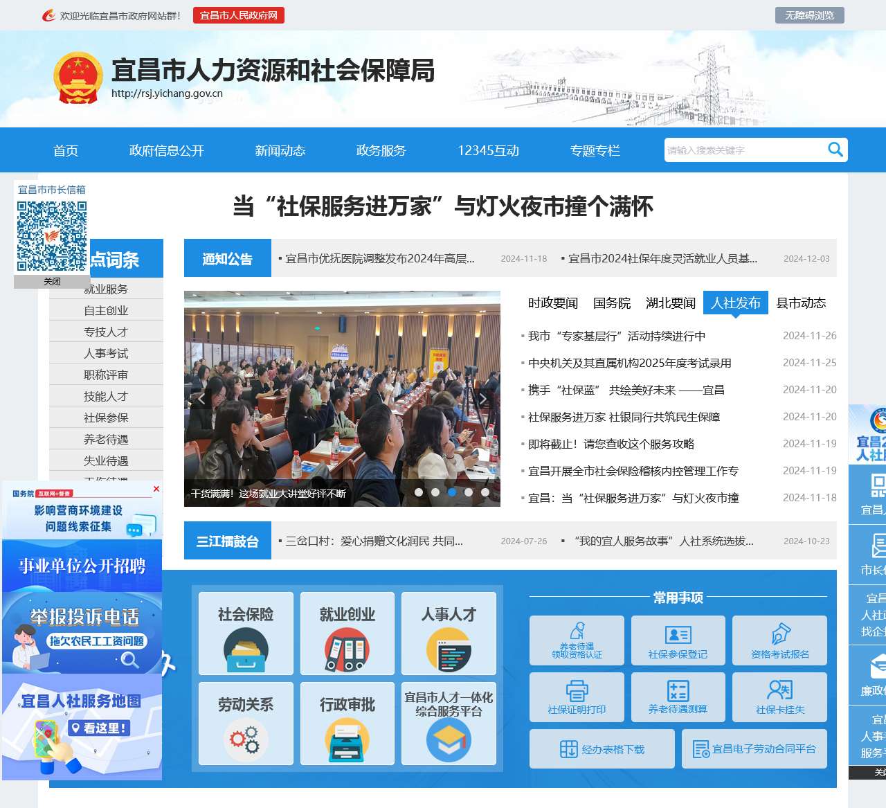 | 通知公告 | 关于2024年省特级专家选拔评审结果(2024-11-29)、关于征集“劳务黑中介”线索的公告(2024-11-25)、宜昌市优抚医院调整发布2024年高层(2024-11-18) |
