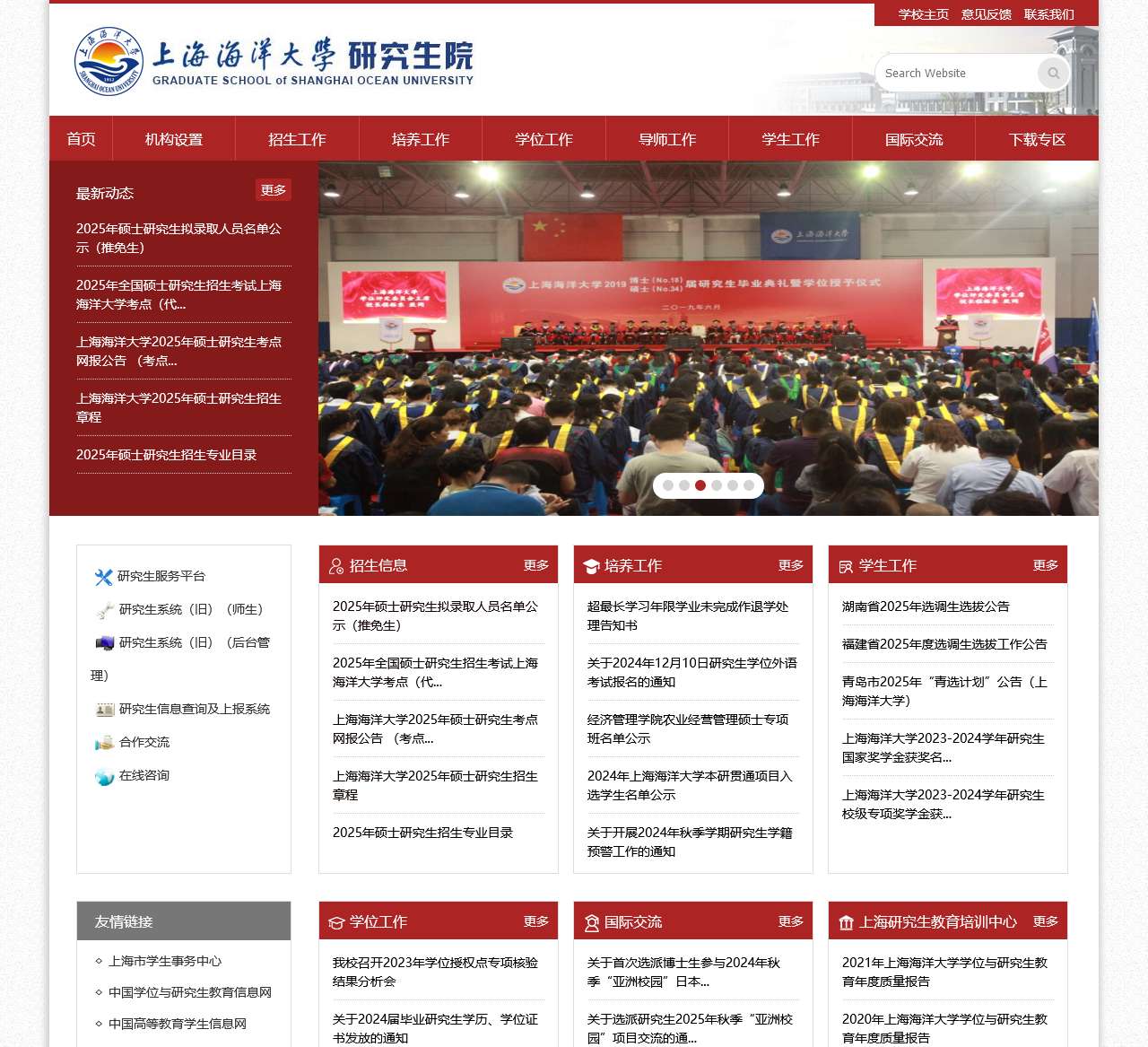 | 学位工作相关 | 2025年硕士研究生拟录取人员名单公示(推免生) 2025年全国硕士研究生招生考试上海海洋大学考点(代报) 上海海洋大学2025年硕士研究生考点网报公告(考点) 上海海洋大学2025年硕士研究生招生章程 2025年硕士研究生招生专业目录 |