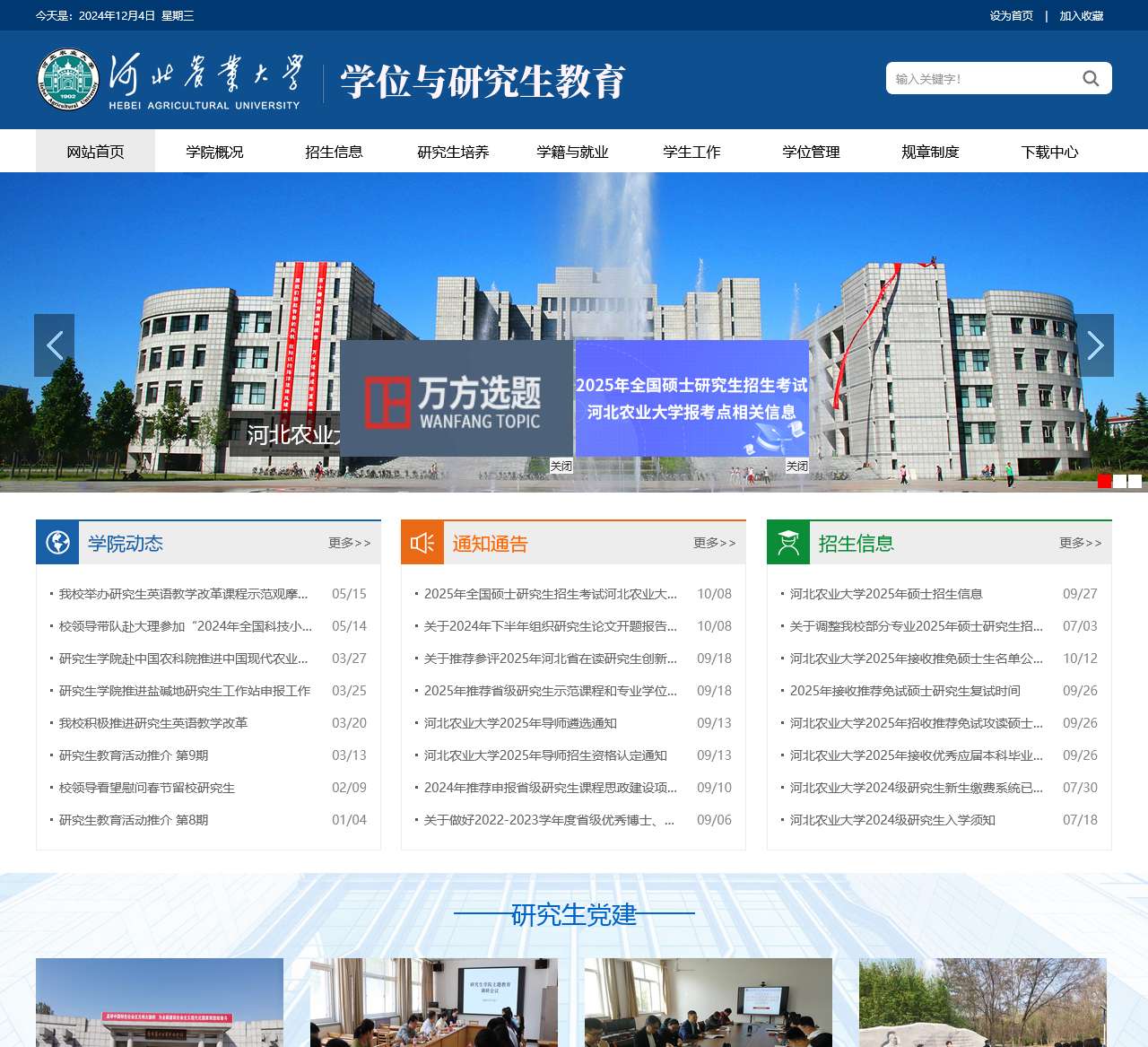 | 招生通知 | 2025年全国硕士研究生招生考试河北农业大…、关于2024年下半年组织研究生论文开题报告…、关于推荐参评2025年河北省在读研究生创新…、2025年推荐省级研究生示范课程和专业学位…、河北农业大学2025年导师遴选通知、河北农业大学2025年导师招生资格认定通知、2024年推荐申报省级研究生课程思政建设项…、关于做好2022-2023学年度省级优秀博士、… |