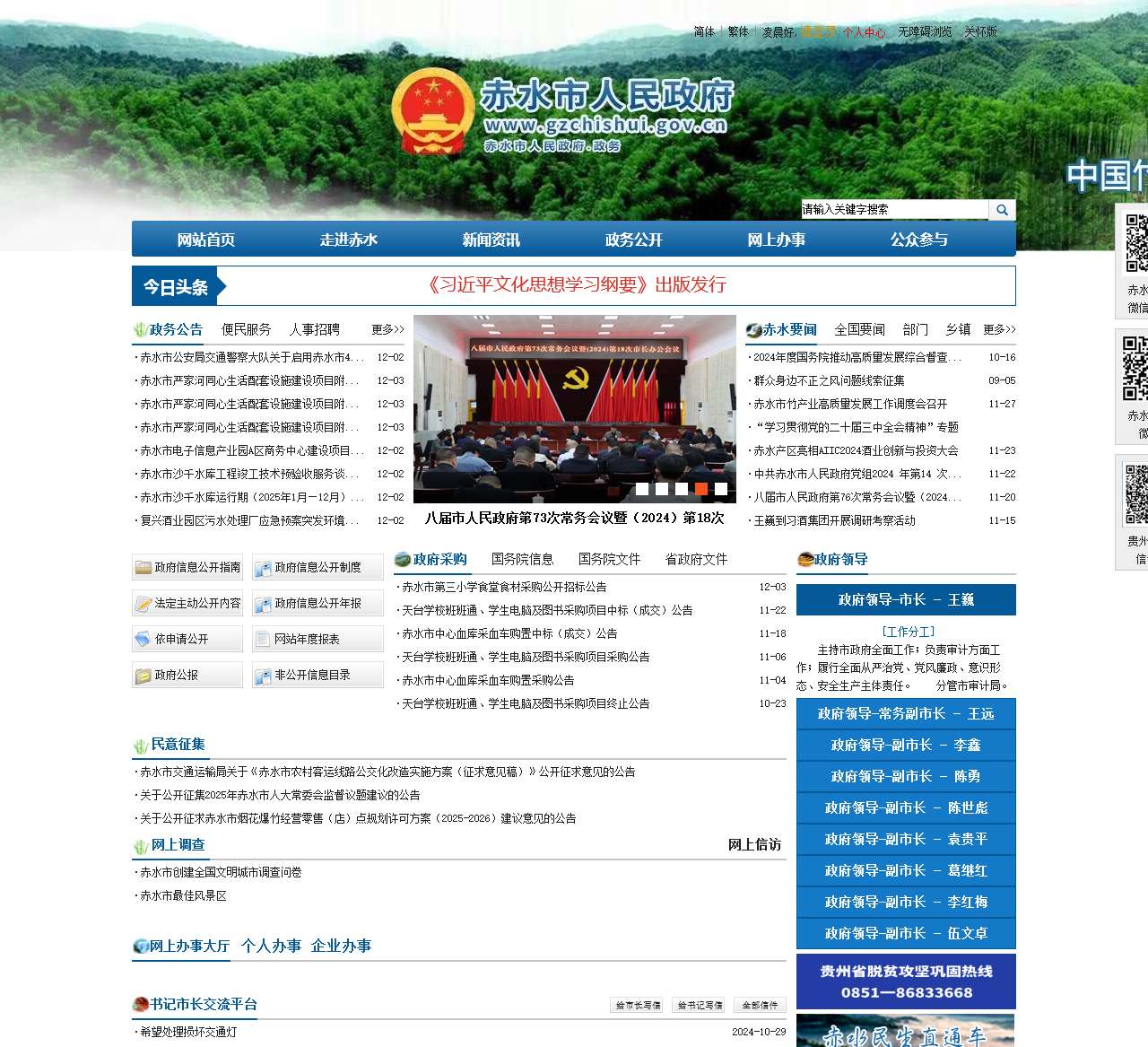 | 公众参与与调查 | – 群众身边不正之风问题线索征集 – 2024年度国务院推动高质量发展综合督查征集问题线索 – 关于公开征集2025年赤水市人大常委会监督议题提议的公告 – 赤水市创建全国文明城市调查问卷 |