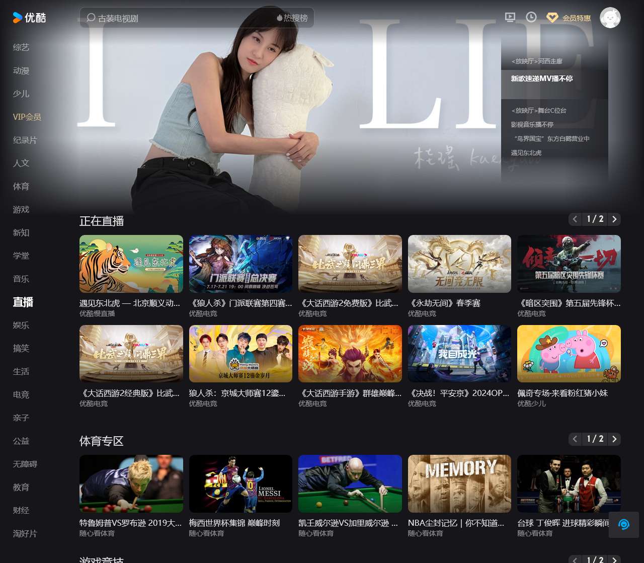 | 体育 | 提供各种体育赛事的直播与点播内容,包括篮球、足球、电竞等。 |