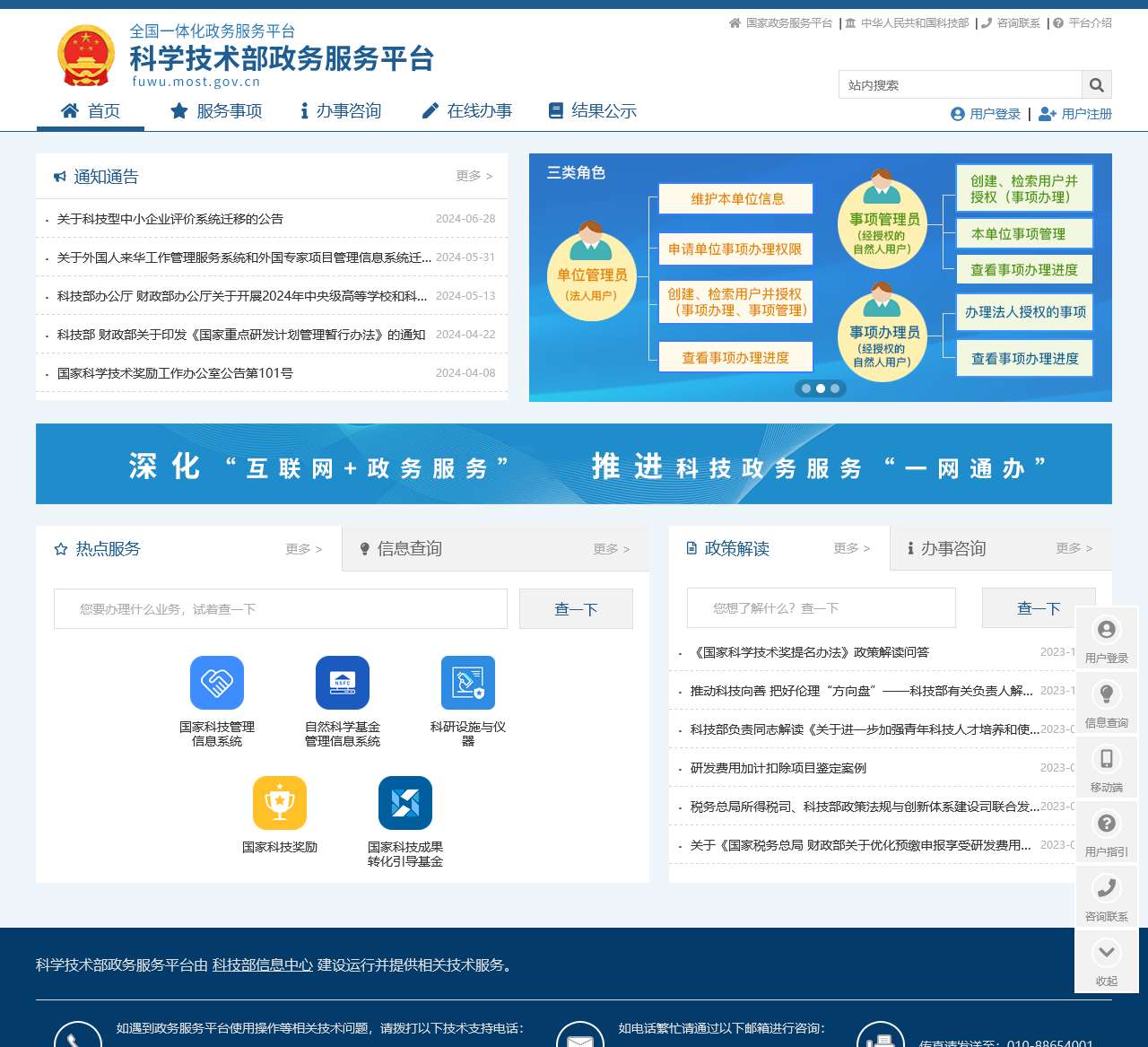 | 重点服务事项 | 国家科技管理信息系统、自然科学基金管理信息系统、科研设施与仪器、国家科技奖励、国家科技成果转化引导基金 |