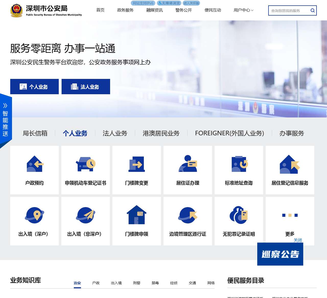 | 用户中心 | 个人中心、法人中心、积分入户查询、年度积分复核、深圳身份证办理、居住证添加等 |