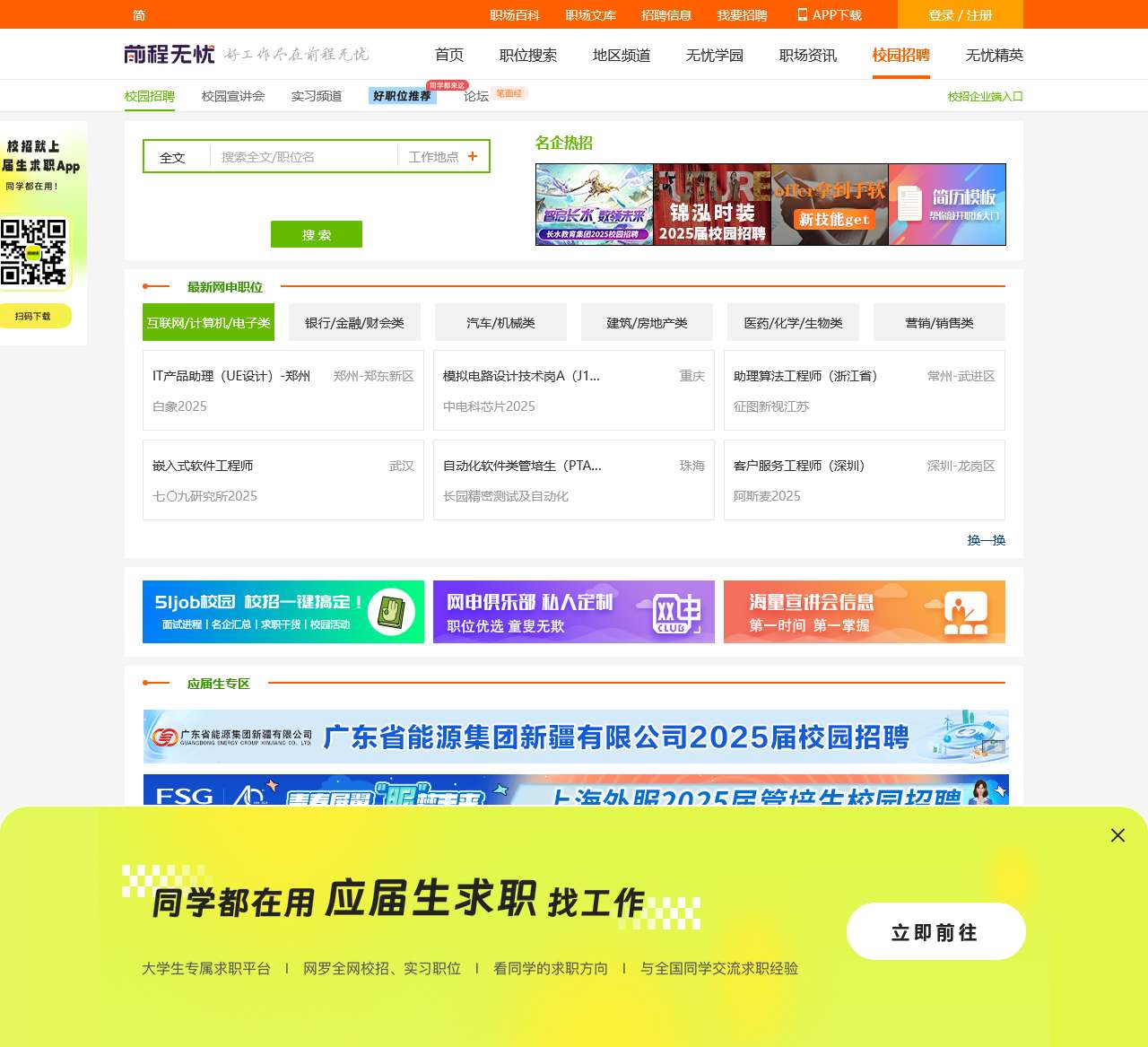 前程无忧校园招聘频道为应届生及在校大学生提供准确全面的企业校园招聘信息,包括网申职位、校园宣讲会、实习招聘信息等,为学生求职提供有力支持。