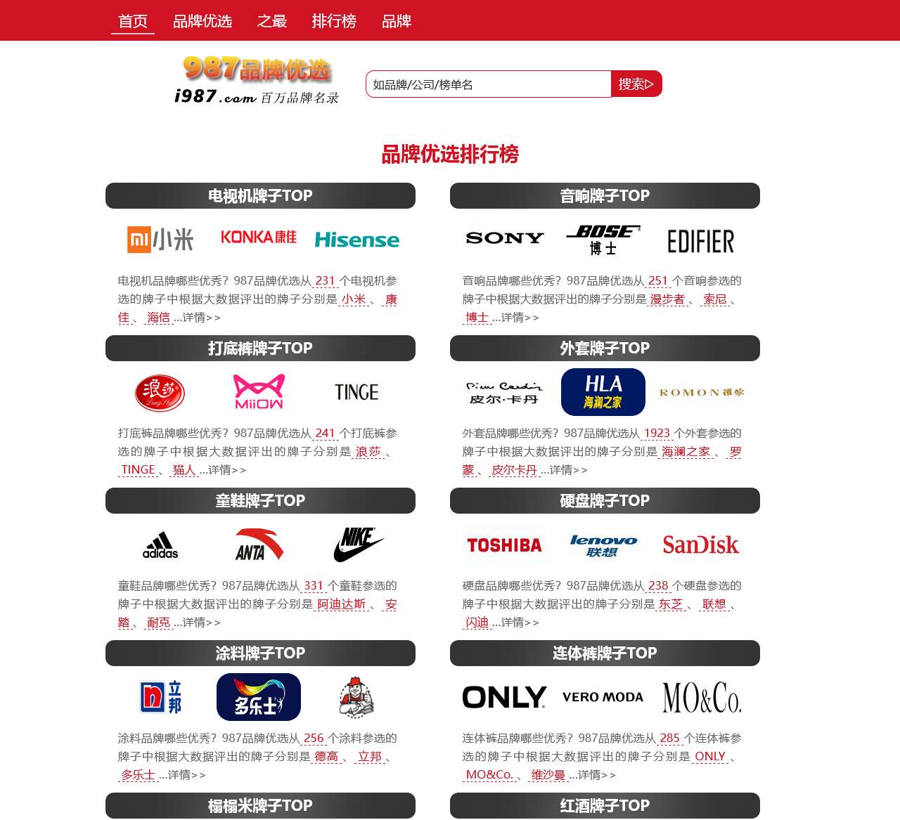 - 电视机、音响、打底裤等多个品牌的TOP排行榜,涵盖广泛产品类别。