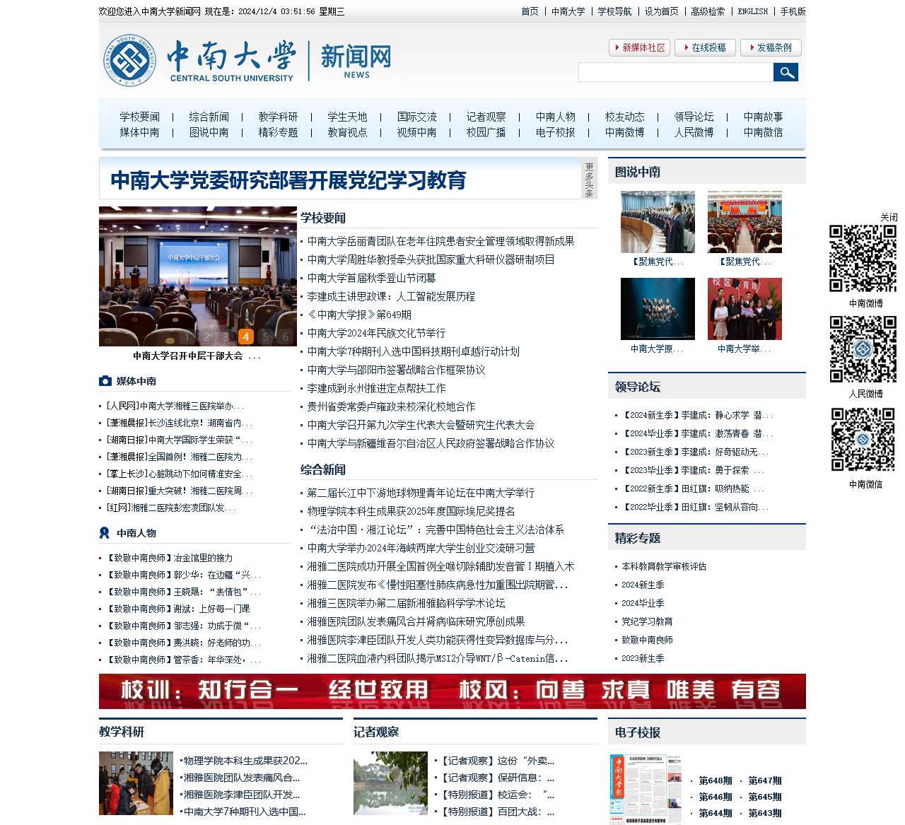 | 教学科研 | – 中南大学7种期刊入选中国科技期刊卓越行动计划 – 中南大学刘辉教授荣获世界互联网大会领先科技奖 – 湘雅医院团队在《英国医学杂志》上发表重大成果 |