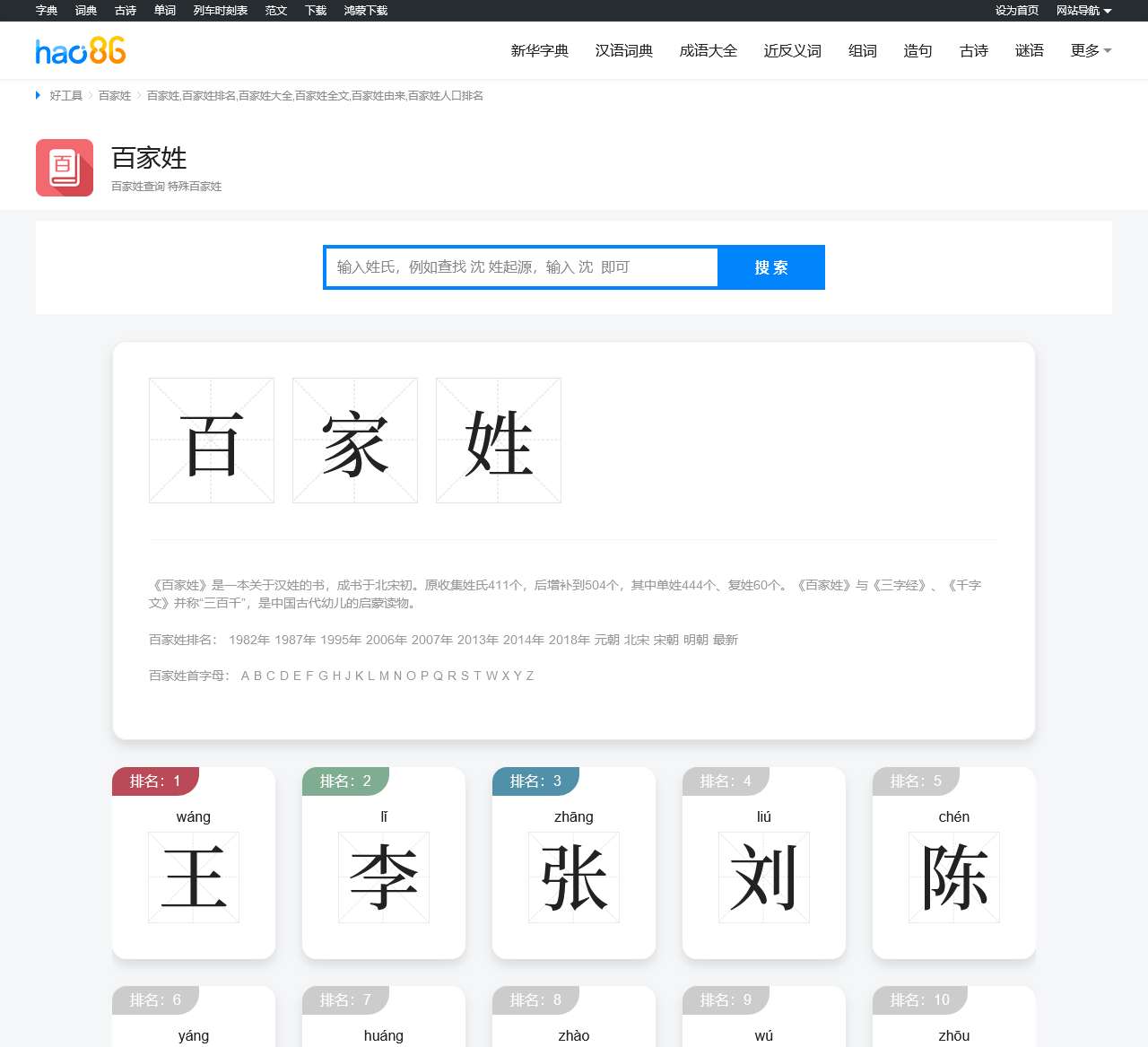 | 百家姓 | 百家姓全文、百家姓排名、百家姓人口、百家姓由来 | 提供百家姓的详细信息,包含历史背景、各个姓氏的起源及排名等内容。 |