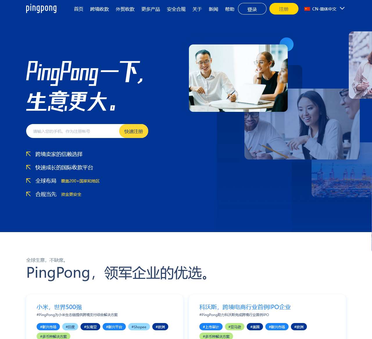 PingPong为中国跨境卖家提供更快、更便捷、更安全的跨境收款服务,围绕跨境商户和中小企业出海的综合需求,PingPong目前已建立了跨境收款、外贸B2B收付款、全球收单、全球分发、供应链融资、汇率管理、出口退税、VAT税务缴纳、SAAS企业服务等多元化的产品体系,产品服务覆盖全流程。