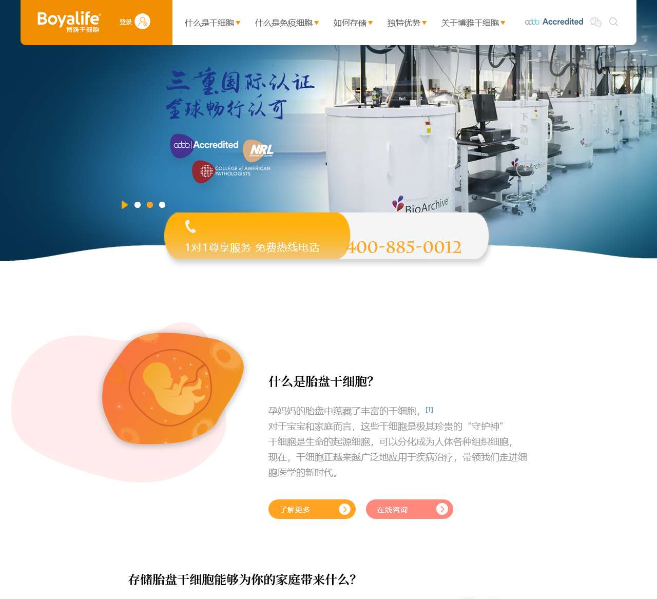 | 优势认证 | 临床级干细胞库,同时通过AABB、NRL、CAP三重权威国际认证 |
