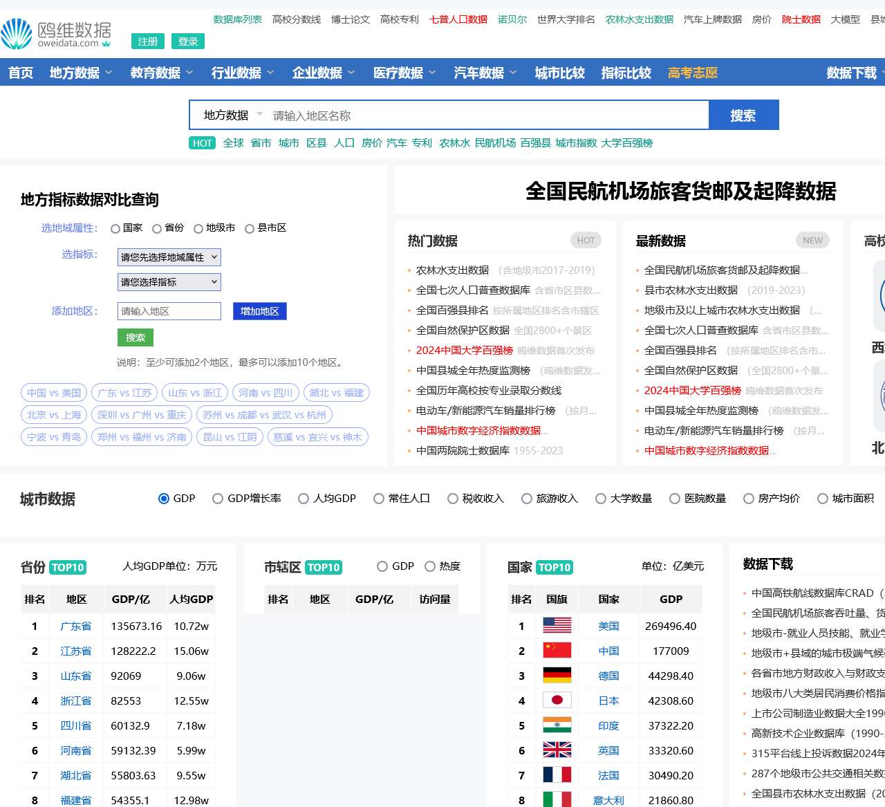 | 特殊数据 | 全国民航机场旅客货邮及起降数据, 农林水支出数据, 全国七次人口普查数据库, 全国百强县排名, 全国自然保护区数据, 2024中国大学百强榜, 中国县城全年热度监测榜, 电动车/新能源汽车销量排行榜, 中国城市数字经济指数数据, 中国两院院士数据库, 最新数据, 全国民航机场旅客货邮及起降数据 |