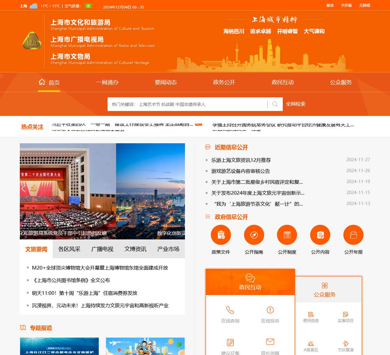 | 文旅要闻 | 数字化创新实践赋能上海文旅行业;国务院“互联网+督查”平台公开征集问题线索;上海市文旅局的文化活动、艺术展览及产业市场动态;“乐游上海”项目。 |