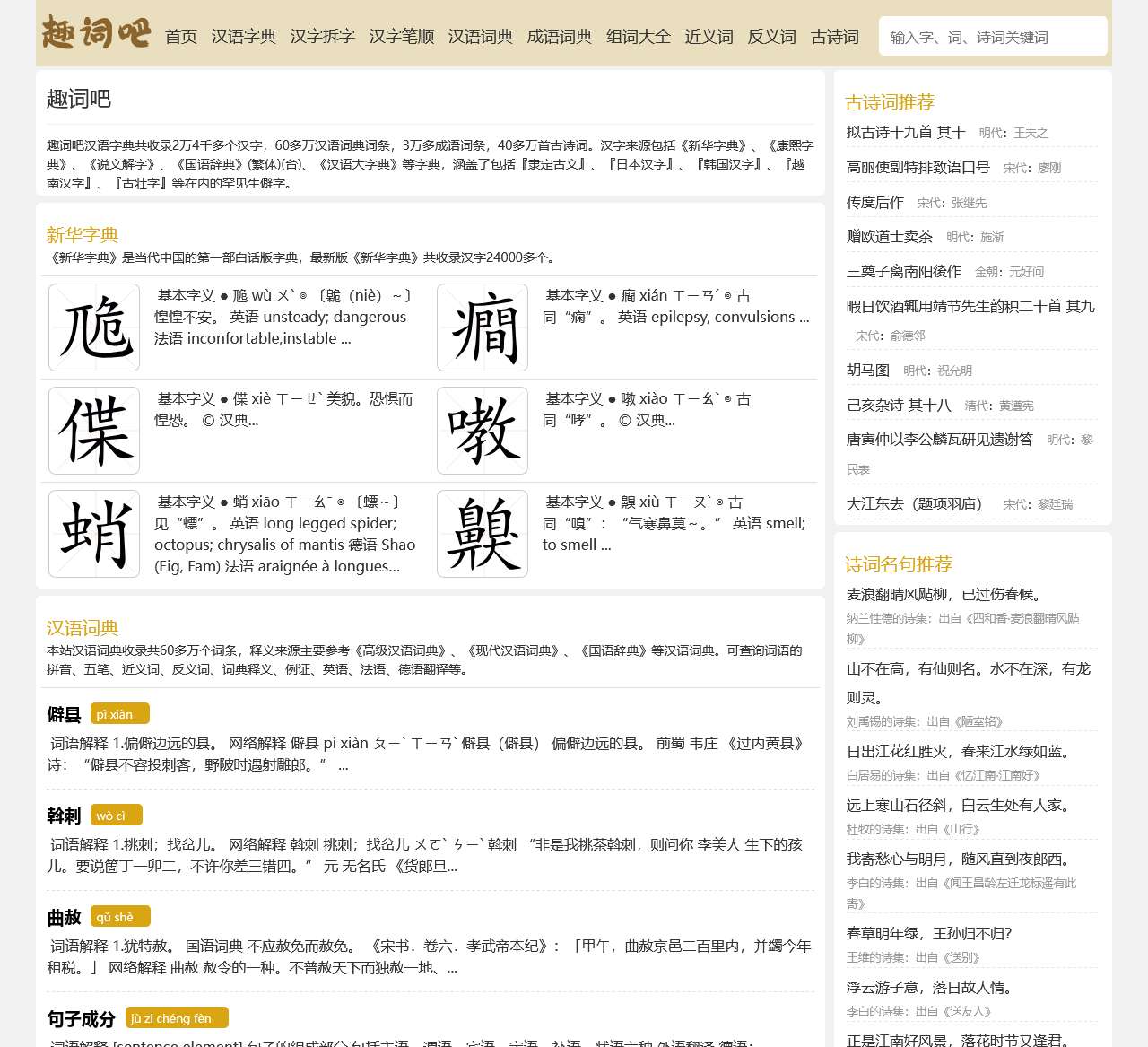 | 首页 | 主要介绍网站的基本功能和导航,包括汉语字典、汉字拆字、词典等。 |