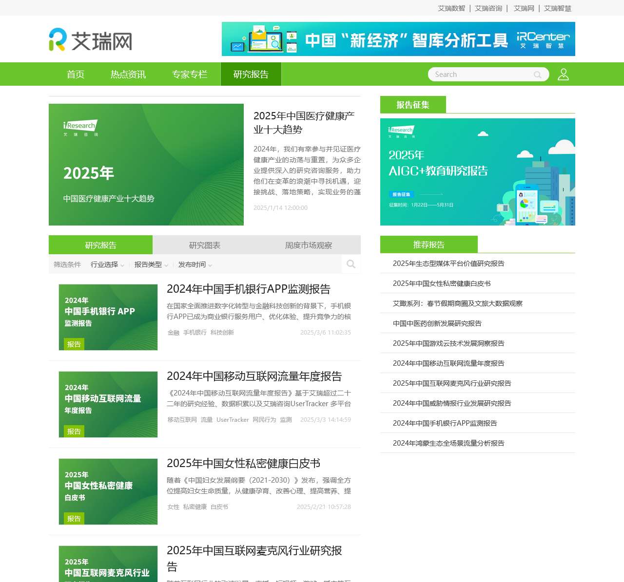 | 行业研究报告(部分) | 包括2025年中国医疗健康产业十大趋势报告、2024年中国手机银行APP监测报告等,深入分析各行业的发展趋势与未来展望 |
