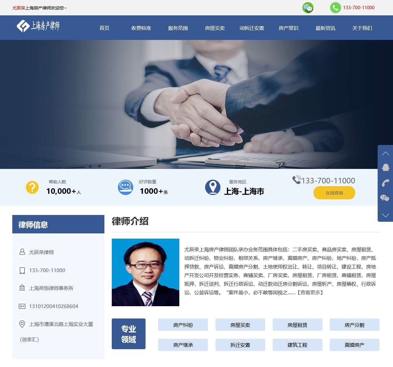 上海房产律师网是由执业21年资深专业上海房产纠纷律师尤辰荣为首的房产律师专家团队组成,本站专注于处理各种房产纠纷法律咨询与房产纠纷案件。咨询热线电话:13370011000